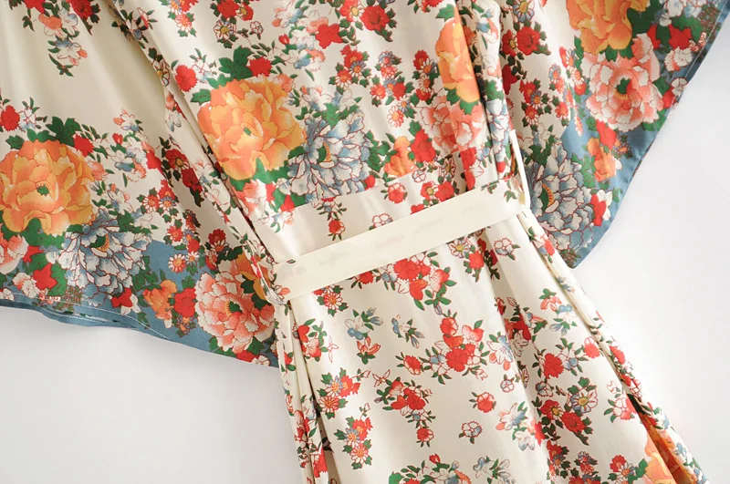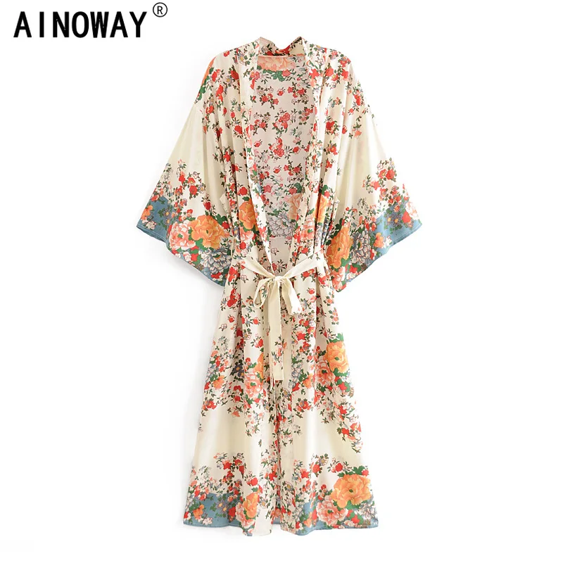 Женское винтажное кимоно с цветочным принтом, длинное платье из искусственного шелка с поясом, V-образным вырезом и рукавами летучая мышь, накидка в стиле бохо