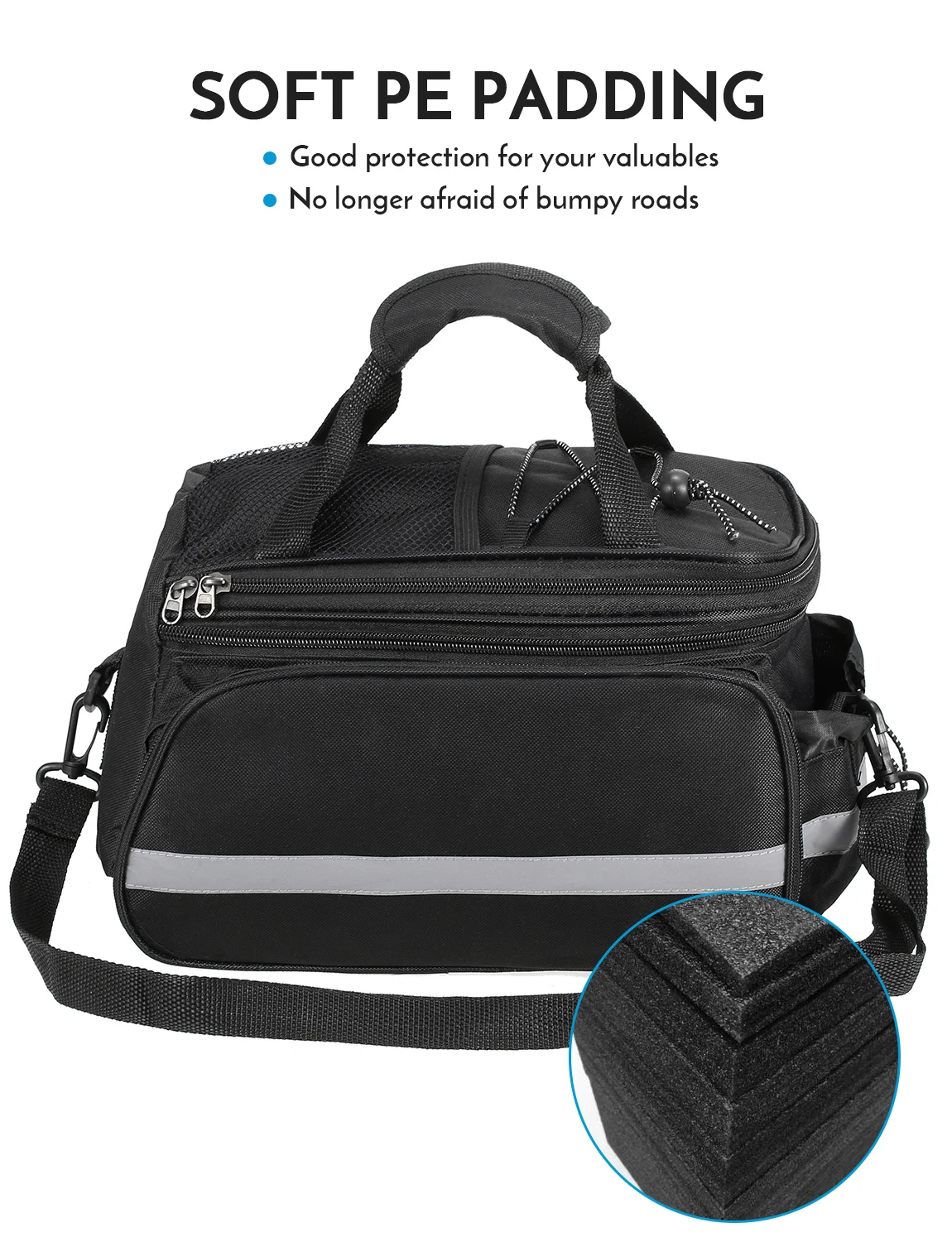 Двойная защита-четыре стороны велосипедного багажника утолщены, чтобы обеспечить амортизацию и уменьшить вибрацию при езде по неровным дорогам. Пряжка для чайника предназначена для легкого удаления и фиксации чайника. Отделение для чайника оснащено широкополыми огнями и светоотражающими полосками, с широкими отражениями на обеих сторонах сумки для двойной безопасности во время езды.