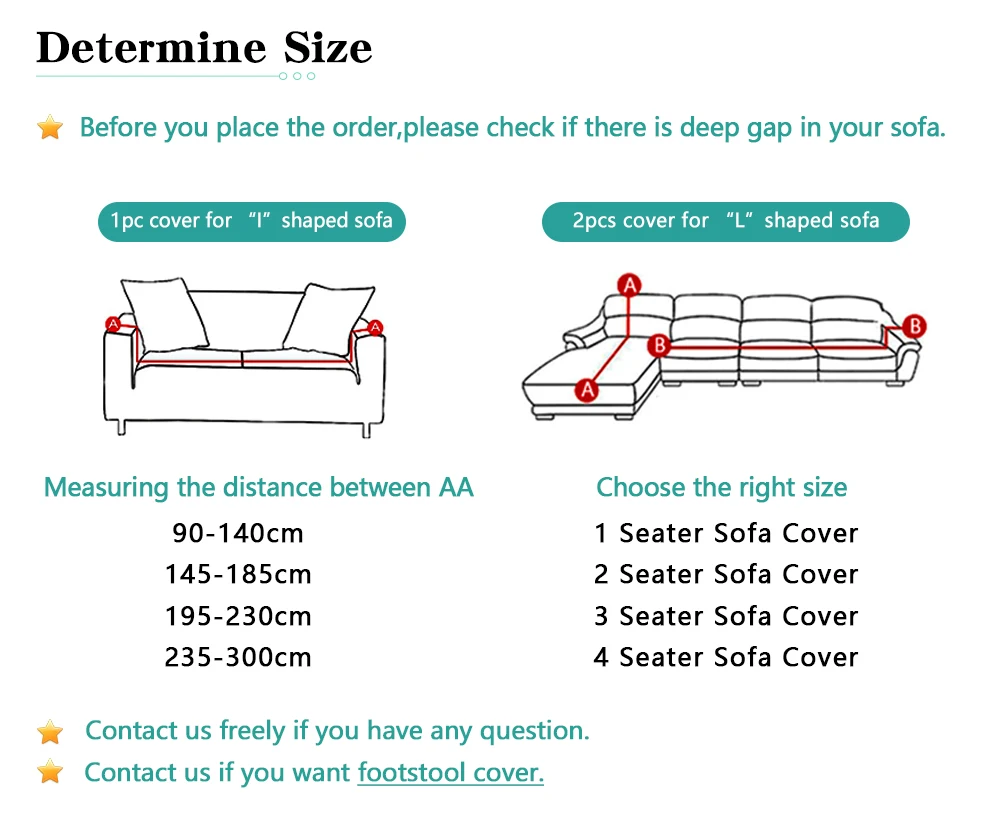 Внимательно измерьте размер своего дивана. Учтите и подлокотники. Если вы не учтите подлокотники, чехол может не подойти на ваш диван. 1. Чехол для одноместного дивана, Длина дивана должна быть в пределах 90-140 см 2. Для дивана на два места длина чехла дивана должна быть в пределах 145-185 см 3. Для трехместного дивана длина чехла Диван должен быть 195-230 см 4. Для четырехместного дивана длина чехла должна быть 235-300 см 5. Для секционного или углового дивана мы предлагаем приобрести 2 Чехлы. Размер чехла будет зависеть от длины линий AA, BB и CC. Например: если AA = 200 см, BB = 160 см, то выбирайте чехол на 1 диван на три места и 1 диван на два места.