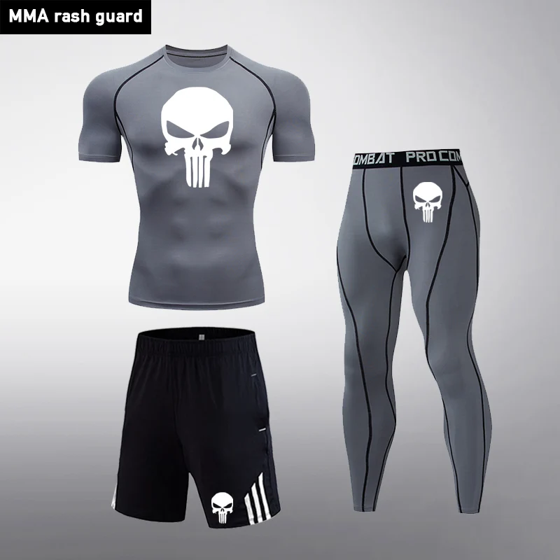 Мужской компрессионный комплект с черепом, футболка с коротким рукавом для ММА, мужские спортивные трико, штаны, одежда для фитнеса, бодибилдинга, тренировок, бега