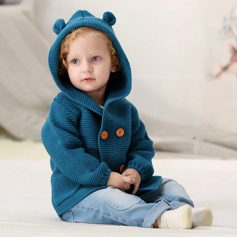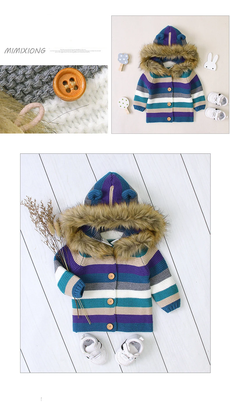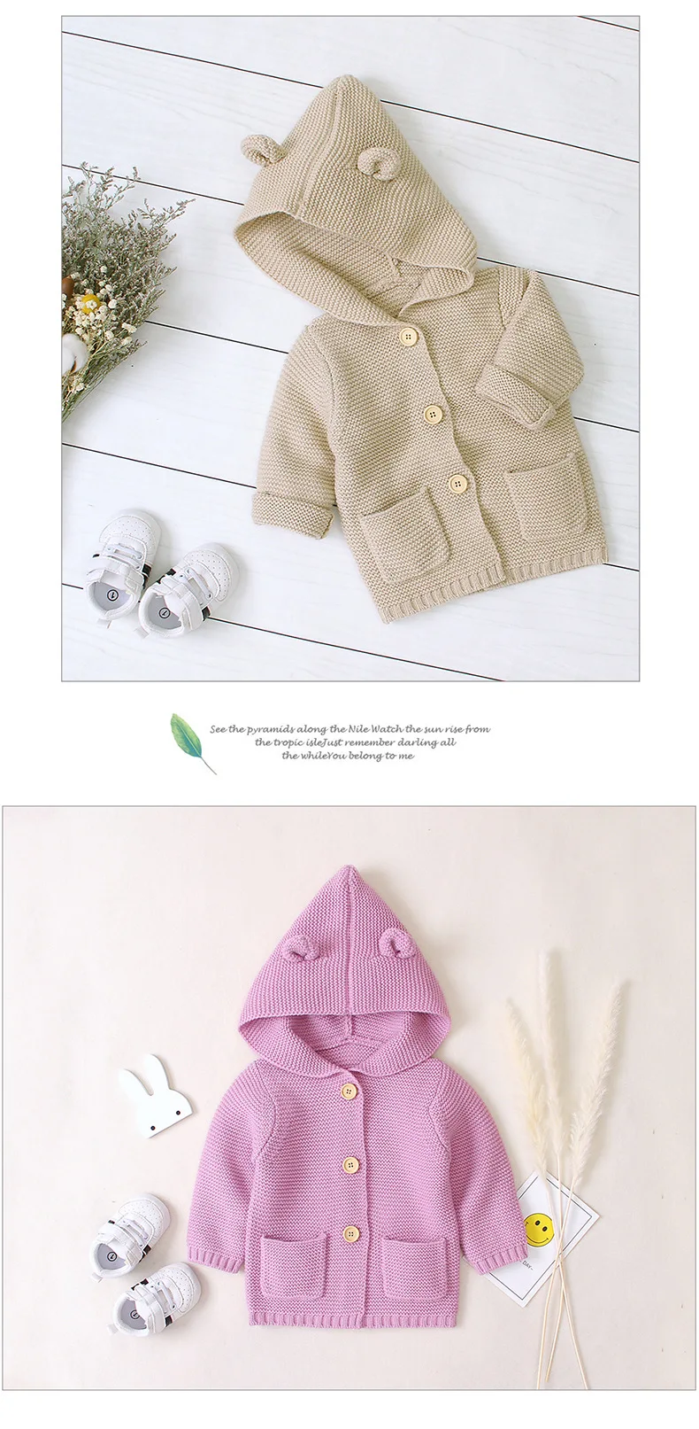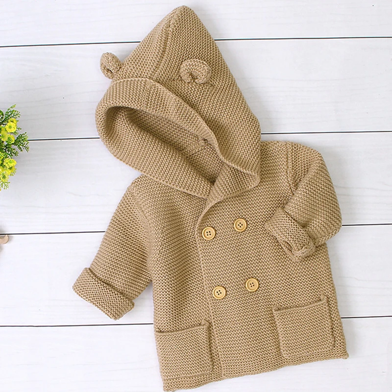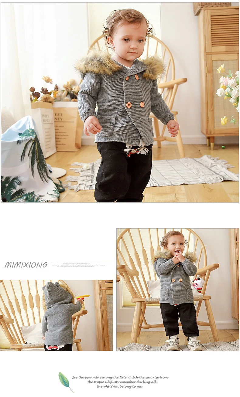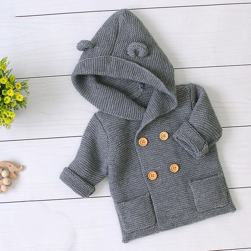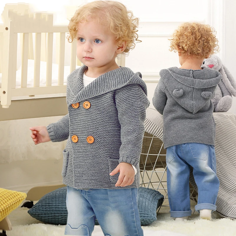 Вязаный кардиган для маленьких мальчиков, зимние теплые свитера для новорожденных, модное пальто с капюшоном и длинным рукавом, детская одежда, наряды
