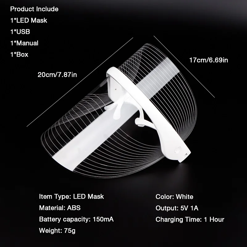 Красный свет 630 нм Синий свет 470 нм Зеленый свет 520 нм Желтый свет 590 нм Фиолетовый свет 380-420 нм Голубой свет 470 нм Белый свет 510-810 нм Размер в упаковке 200x180x70 мм Вес маски (без упаковки) 80 г Рекомендуемый возраст От 16 до 60 лет Кабель USB длина примерно 100 см Блок питания DC 5 В. ,1А (в комплект не входит) Тип аккумулятора Li-Ion,3,7В 200 мА°ч