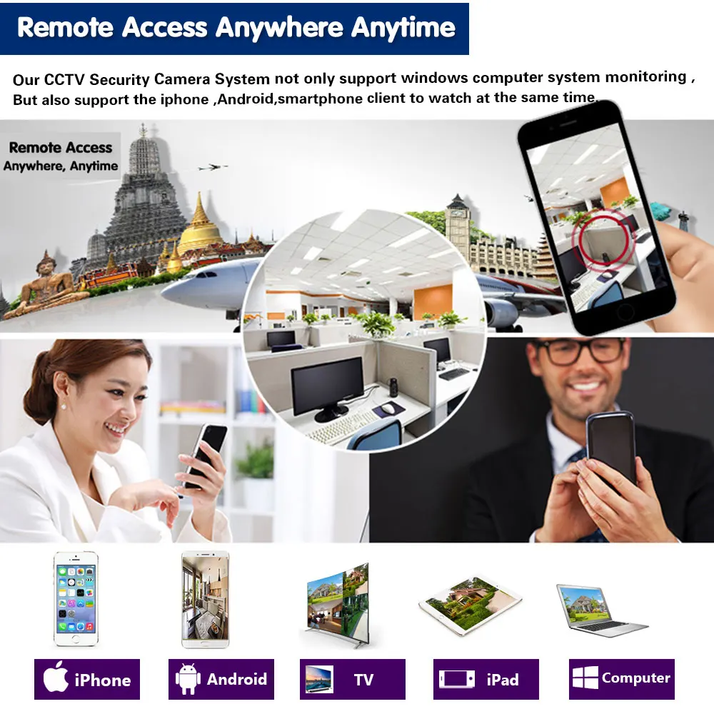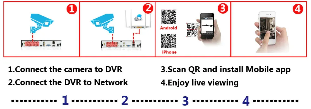 Простая настройка, всего 4 шага для просмотра мобильный телефон, просмотра видео в режиме реального времени из любого места и в любое время с помощью смартфона,Таблица или ПК с передовой технологией P2P, вы можете получить удаленный доступ к вашей системе в течение нескольких минут или меньше, нет необходимости в переадресации,Удаленный доступ никогда не был таким простым!