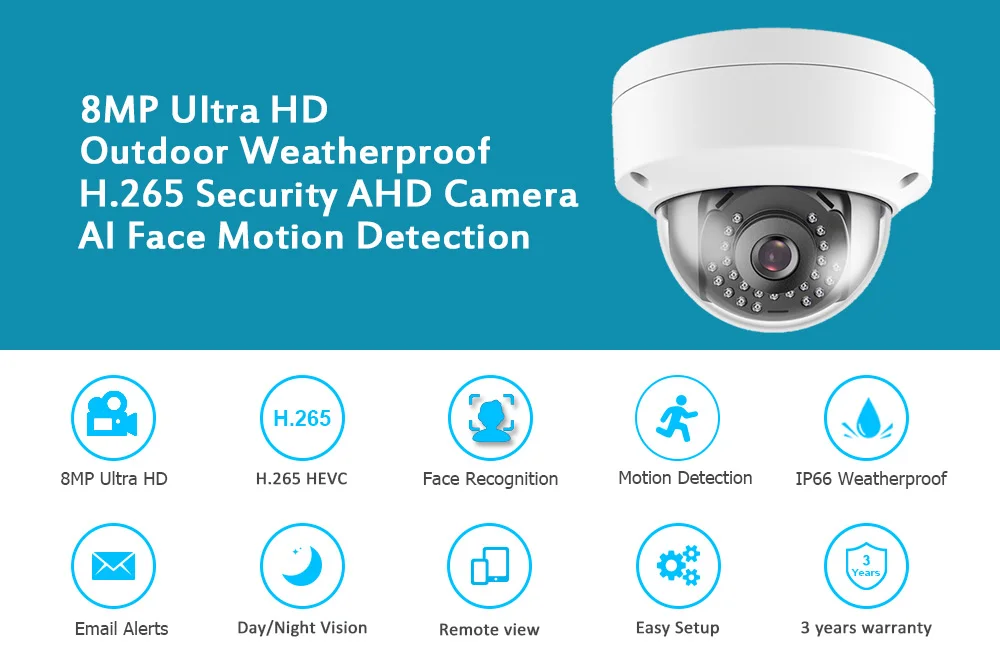 1, Ультра HD 4K & 8MP & 5MP дисплей высокой четкости;2. Ультра HD 8MP и 5MP AHD камера, металлический материал, IP66 водонепроницаемый, подходит для внутреннего и наружного использования; Пылезащитная, надежная Домашняя безопасность;3. Улучшенное H.265 Сжатие видео, подключи и работай, простота установки;4. Поддержка распознавания лица, записи лица, воспроизведения лица, обеспечивает ультра высокое разрешение видео наблюдения, обеспечивая максимальную детализацию и четкость доступны;5. Поддержка ночного видения Ultra HD, расстояние передачи составляет 500 метров;6. Поддержка IR-CUT переключателя двойного фильтра, днем и ночью для достижения мониторинга, цвет не является частичным искажением цвета;7. Поддержка обнаружения движения, оповещения по электронной почте, воспроизведения видео;8. Поддержка Android,Iphone,Ipad, ПК, P2P просмотра;9, удаленный доступ в любом месте, в любое время;10, подходит для всех видов мест применения;