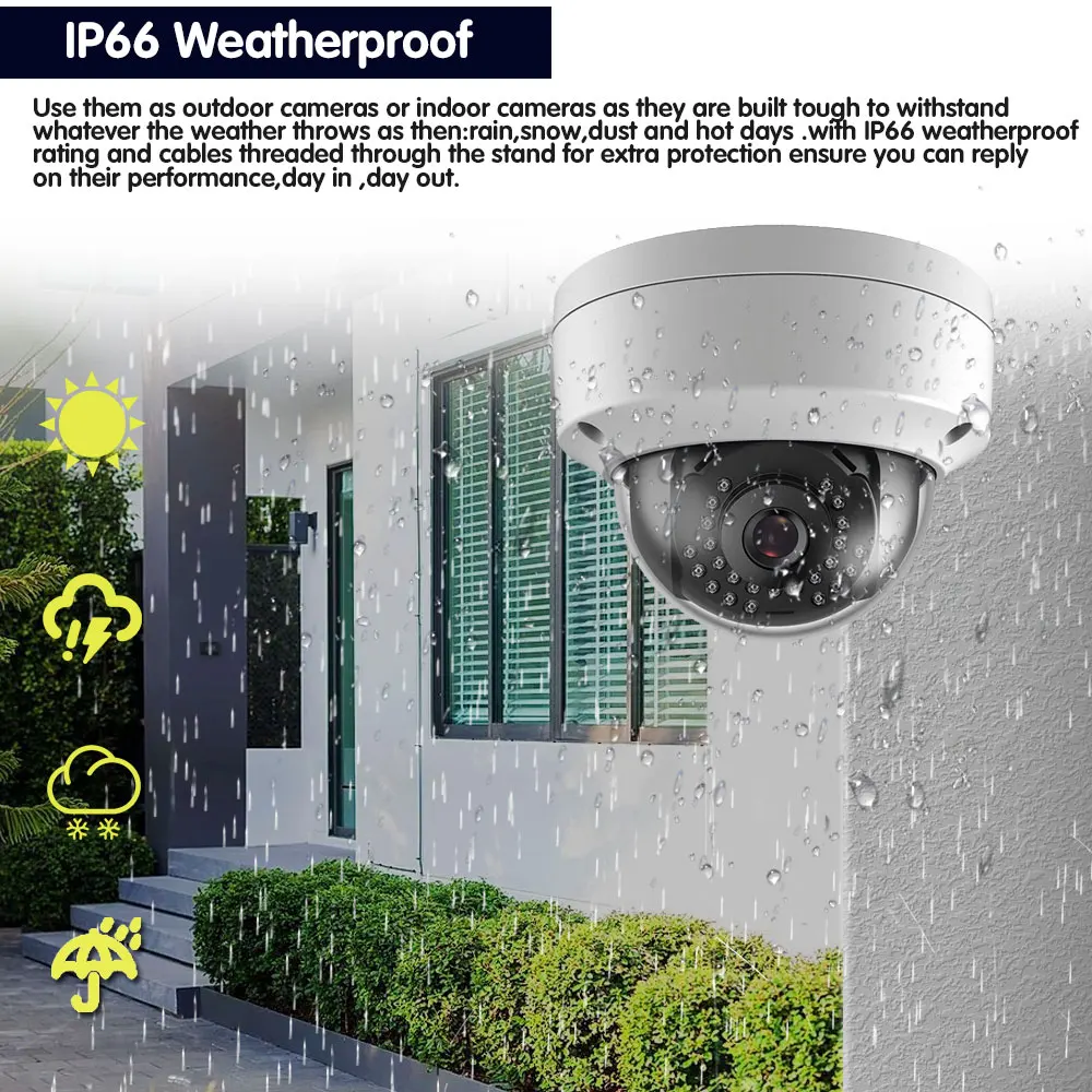 Используйте их в качестве наружных камер или крытых камер, так как они построены жестко, выдерживает любую погоду: дождь, снег, пыль и жаркие дни. С защитой от атмосферных воздействий IP66 и кабелями, просвечивающимися через подставку для защиты, гарантируем, что вы сможете ответить на их производительность, день в день. Наша камера имеет сверхпрочный металлический корпус, профессиональный IP66, устойчивый к атмосферным воздействиям, обеспечивая стабильную производительность как внутри, так и снаружи.