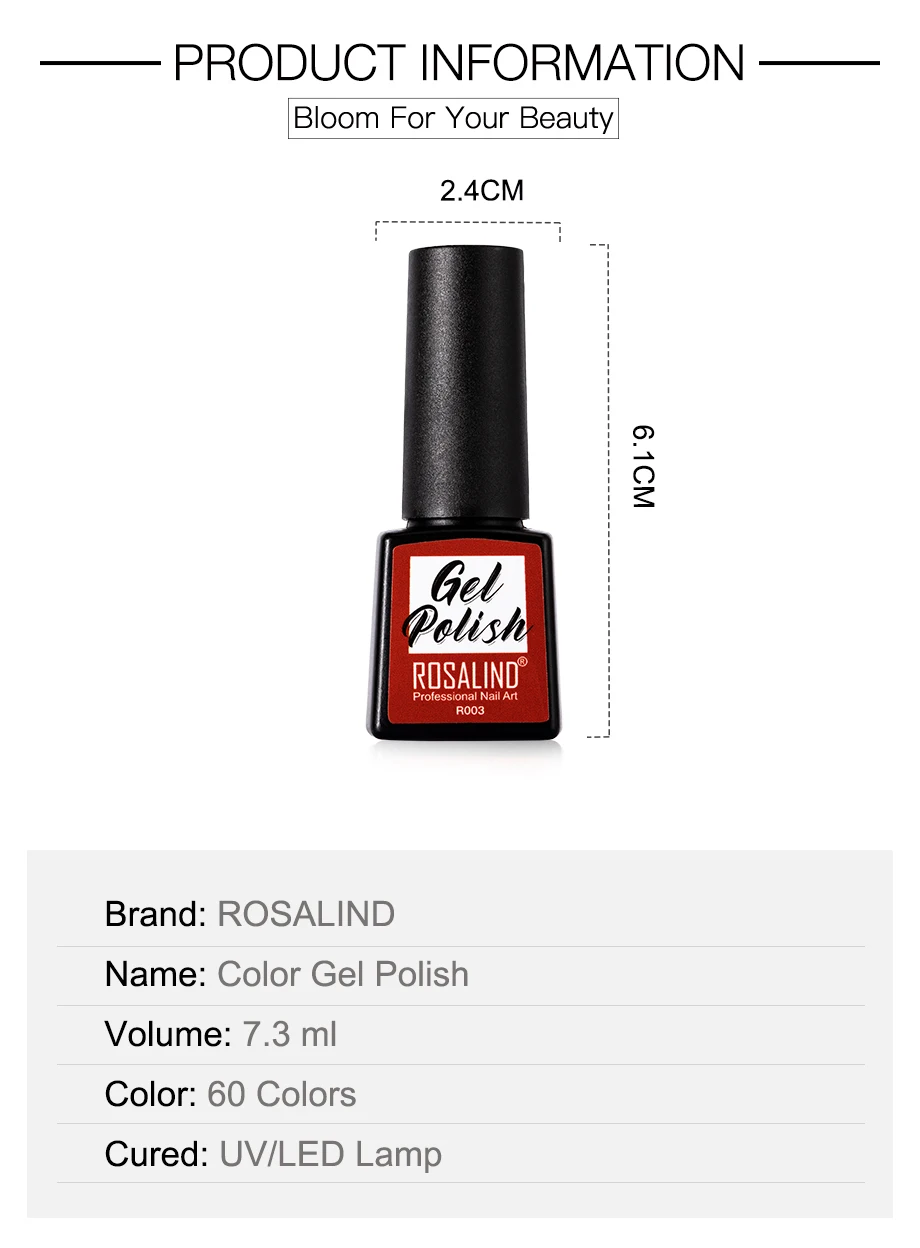 Характеристики Товара:Бренд: ROSALINDНазвание: Цветной Гель-лакОбъем: 7,3 млЦвет: 60 цветовОтверждение: УФ/Светодиодная лампа-Качество-наш первый приоритет.Светильник почти без запаха (средний запах имеет только верхнее покрытие и основа), мы применяем только органическую текстуру для защиты вашего здоровья.-Цвет будет держать блеск до 30 дней.-Горячие цвета на выбор, подходят для любого повода. Шаг за шагом:-1. Придайте ногтю форму. Слегка отполируйте поверхность ногтевой пластины. Средство.-2. Нанесите базовый слой основы от кутикулы до свободного края (не забудьте закрыть край ногтя). Высушите ногти под светильник кой в течение 10 секунд или под УФ-светом в течение 2 минут.-3. Нанесите тонкий слой гель-лака выбранного цвета. Свободный край крышки. Выдержка: 30 секунд светодиодный Ной лампе или 2 минуты в УФ-лампе.-4. Нанесите 2-й тонкий слой гель-лака на ногти. Подержите под светодиодной лампой в течение 30 секунд или под УФ-светом в течение 2 минут.-5. Нанесите верхнее покрытие. Свободный край крышки. Выдержка: 30 секунд в светодиодный Ной лампе.-6. Удалите липкие остатки на ногтях с помощью очищающего средства. Затем нанесите питательное масло для кутикулы, чтобы увлажнить кутикулу и кожу вокруг ногтя. Для удаления:-1. Замочите ногти в жидкости для снятия акрила примерно на 5 минут.-2. Аккуратно разделите целый кусок эмали на каждый ноготь.Внимание:1. Объем 7,3 мл. Так как емкость флакона составляет более 7,3 мл, флакон не будет полностью заполнен гелем для ногтей!2. Плотно закрывается. Хранить вдали от солнечного света. Хранить в недоступном для детей месте.