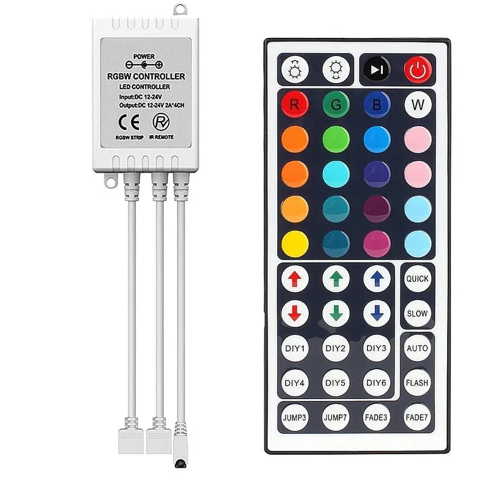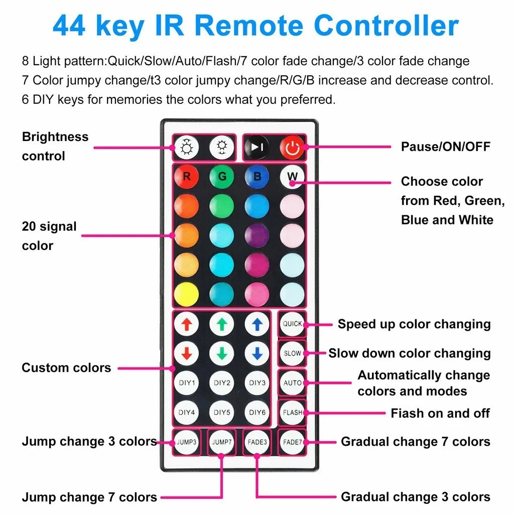 44 ИК-пульт дистанционного управления с Управление;: 8 светильник моделей: быстрое/медленное/автоматическое/мигание/7 Изменение цвета/3 изменения цвета/7 Изменение цвета/3 изменения цвета/R/G/B увеличение и уменьшение контроля. 6 клавиш «сделай сам» для запоминания цветов, которые вы предпочитаете.