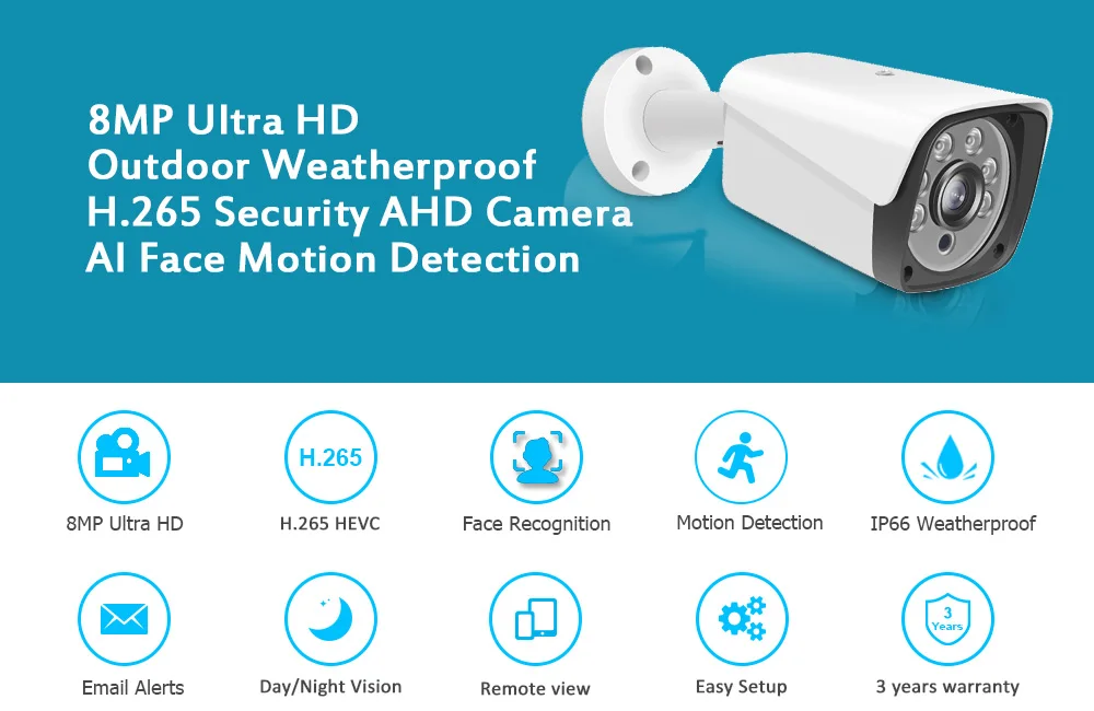 1, Ультра HD 4K & 8MP & 5MP дисплей высокой четкости;2. Ультра HD 8MP и 5MP AHD камера, металлический материал, IP66 водонепроницаемый, подходит для внутреннего и наружного использования; Пылезащитная, надежная Домашняя безопасность;3. Улучшенное H.265 Сжатие видео, подключи и работай, простота установки;4. Поддержка распознавания лица, записи лица, воспроизведения лица, обеспечивает ультра высокое разрешение видео наблюдения, обеспечивая максимальную детализацию и четкость доступны;5. Поддержка ночного видения Ultra HD, расстояние передачи составляет 500 метров;6. Поддержка IR-CUT переключателя двойного фильтра, днем и ночью для достижения мониторинга, цвет не является частичным искажением цвета;7. Поддержка обнаружения движения, оповещения по электронной почте, воспроизведения видео;8. Поддержка Android,Iphone,Ipad, ПК, P2P просмотра;9, удаленный доступ в любом месте, в любое время;10, подходит для всех видов мест применения;