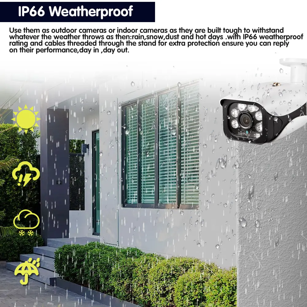Используйте их в качестве наружных камер или крытых камер, так как они построены жестко, выдерживает любую погоду: дождь, снег, пыль и жаркие дни. С защитой от атмосферных воздействий IP66 и кабелями, просвечивающимися через подставку для защиты, гарантируем, что вы сможете ответить на их производительность, день в день. Наша камера имеет сверхпрочный металлический корпус, профессиональный IP66, устойчивый к атмосферным воздействиям, обеспечивая стабильную производительность как внутри, так и снаружи.