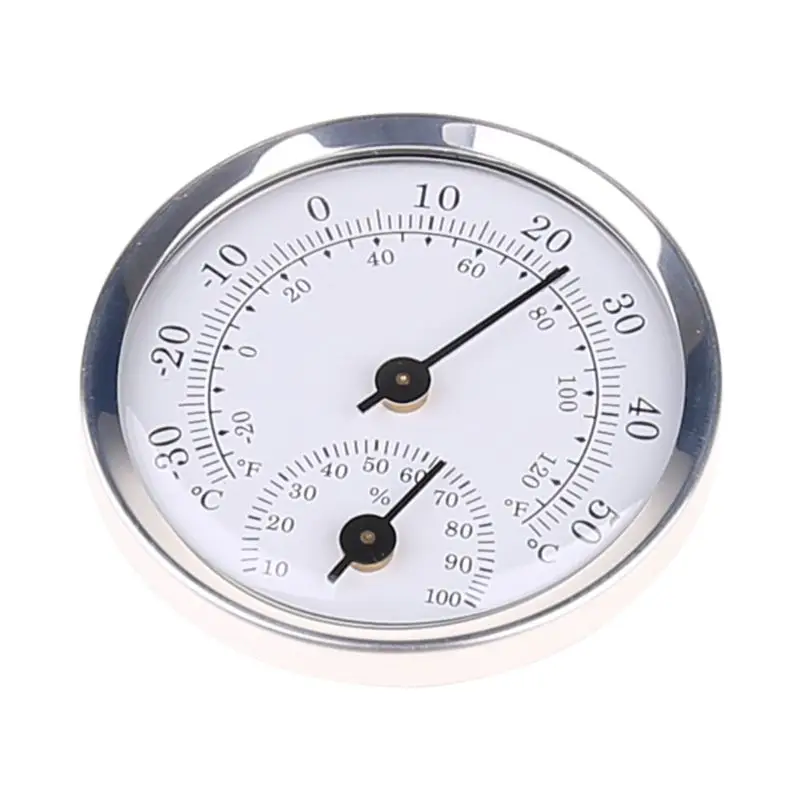 Спецификация:Диапазон измерения температуры: -30 ~ 50 ℃ (-20 ~ 120 ℉), Точность: +/-2 ℃Диапазон измерения влажности: 0 ~ 100% RH, Точность: +/-5% RH (40 ~ 70% RH)Материал: внешнее кольцо из алюминиевого сплава и нижний чехол из алюминиевого сплава, циферблат из ПВХ-пленки, алюминиевая указка, пластиковые линзыДиаметр: 58 мм/2,28 дюймаЦвет: белый и серебристыйКоличество: 1 шт.
