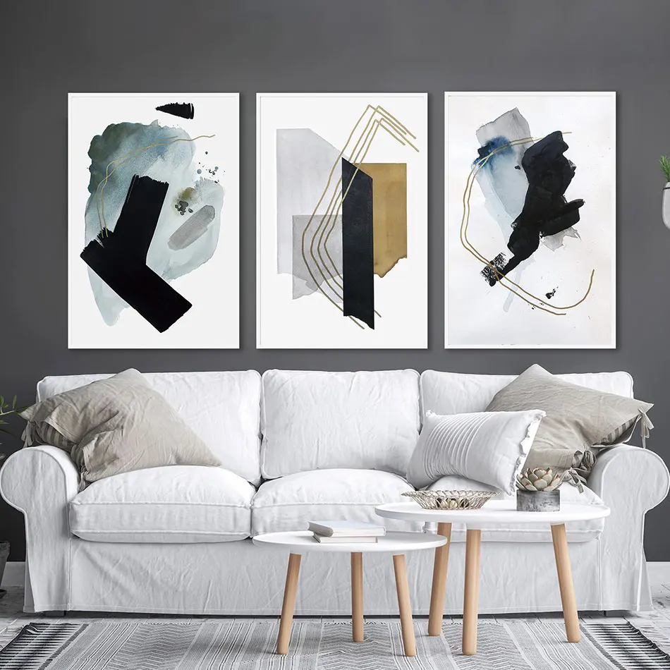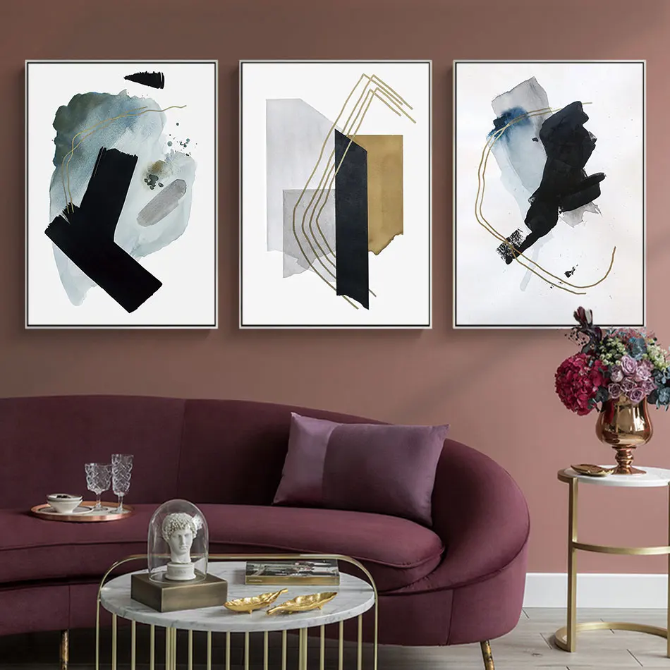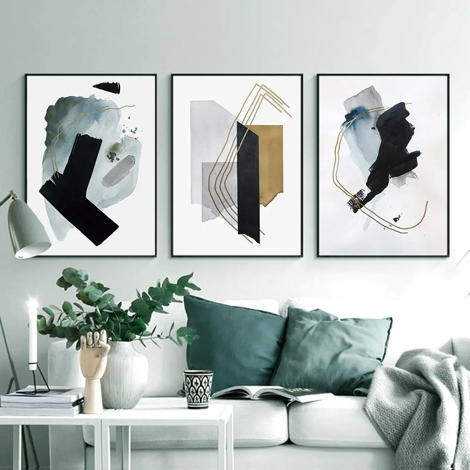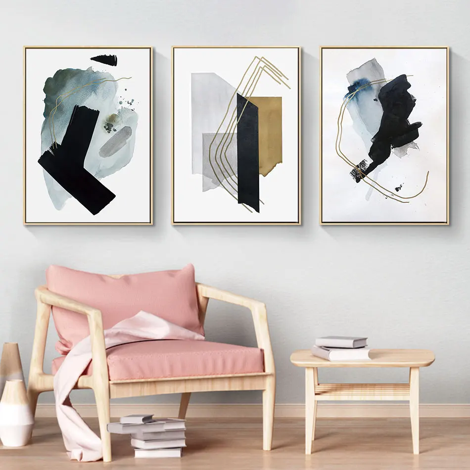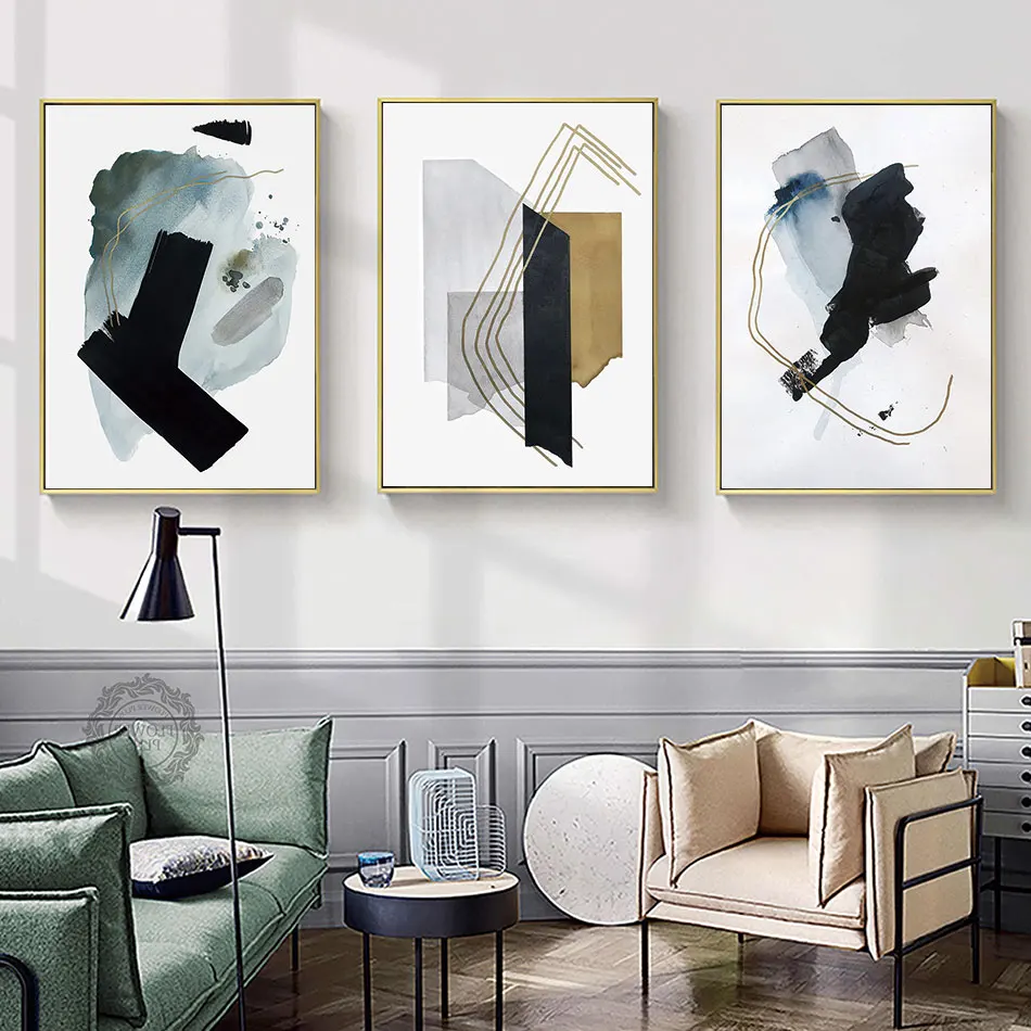 Прямая поставка, Абстрактная Картина на холсте, черные, серые акварельные золотые линии, картины, 3 панели, Настенная картина, плакат, домашний декор