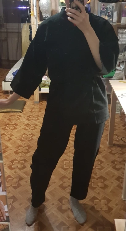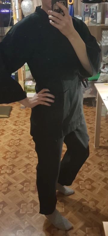 Штаны длинные, нормальное кимоно для дома. Я 178, 74 кг, размер L чуток великоват, подгоню на машинке за 5 минут