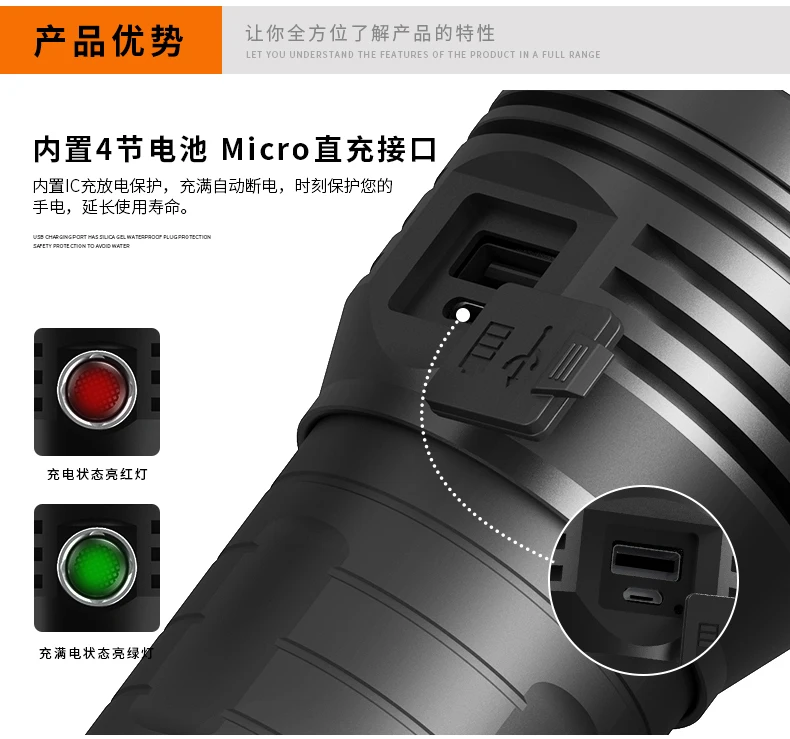 Переключатель:Нажмите на переключательДиапазон:300-1000 метровАккумулятор:Встроенный литиевый аккумулятор 4*18650Стойло:Сильный светильник-слабый светильник-вспышка burst [Длительное нажатие в течение 2 секунд для выключения]Водонепроницаемость:IPX5 [ежедневно водонепроницаемый]Материал:Алюминиевый сплавУгол луча:120 °Метод зарядки:Микро порт для зарядкиВход и выход:5V1AРазмер:118 мм * 61 мм * 50 мм