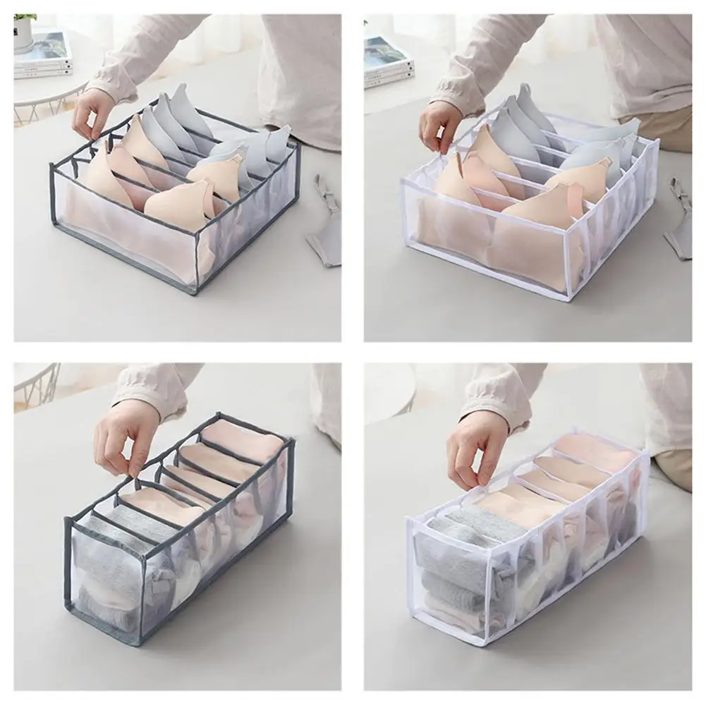 Наименование: Набор органайзеров для хранения в шкафу Материал: нейлон Стандарты: 6 ячеек, 7 ячеек, 11 ячеек Размеры: как показано на рисунке Емкость:6 ячеек для хранения бюстгальтера: можно хранить 6 бюстгальтеров, можно положить повседневные чашки7 сетка для хранения трусиков: можно хранить 14 трусиков, внутренняя сетка увеличена для увеличения вместимости,11 ячеек для хранения носков: можно хранить 22 пары носков, также можно разместить зимние носки Использование: хранение нижнего белья, носковКомплектация: