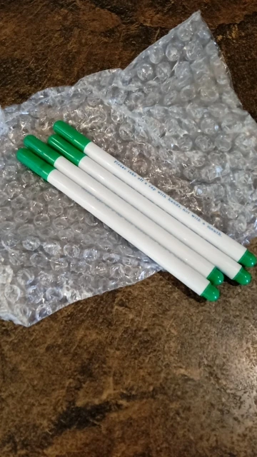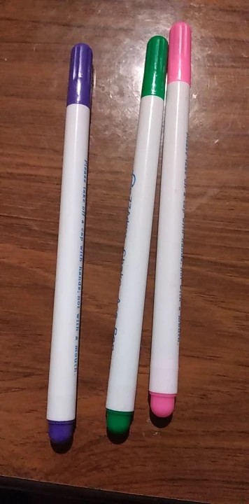 Маркеры очень удобны при раскрое. Раньше (у другого продавца, но этого же производителя) заказывала маркеры, разноцветные. Фиолетовый-желтые оказались сухие, голубой - вещей 10 раскроила и пишет до сих пор, а вот белого не хватило даже на раскрой юбки. попробовала разбавить водкой - хватило на одну линию. Маркеры из этого заказа проверила, пишут, линия проявляется через пару секунд. Смывается с ткани без следа. Но на сколько их хватит - неизвестно