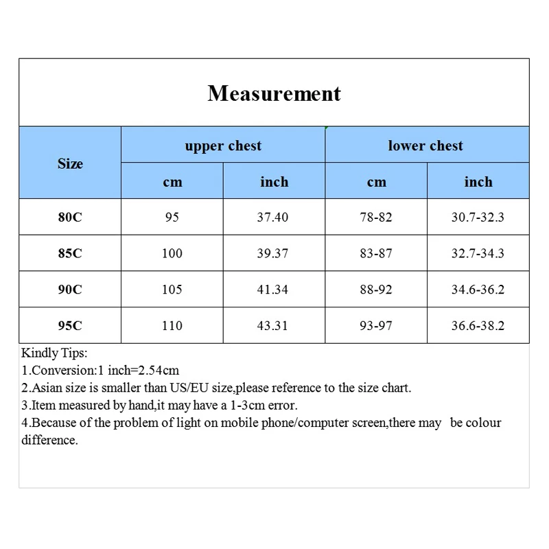 1. Пожалуйста, внимательно проверьте таблицу размеров, чтобы выбрать правильный размер;2. Ручное измерение, погрешность около 1-2 см, 1 дюйм = 2,54 см. Китайский размер Верхний бюст Под грудью 80C 95C 78-82 см 85C 100 см 83-87 см 90C 105 см 88-92 см 95C 110 см 93-97 см