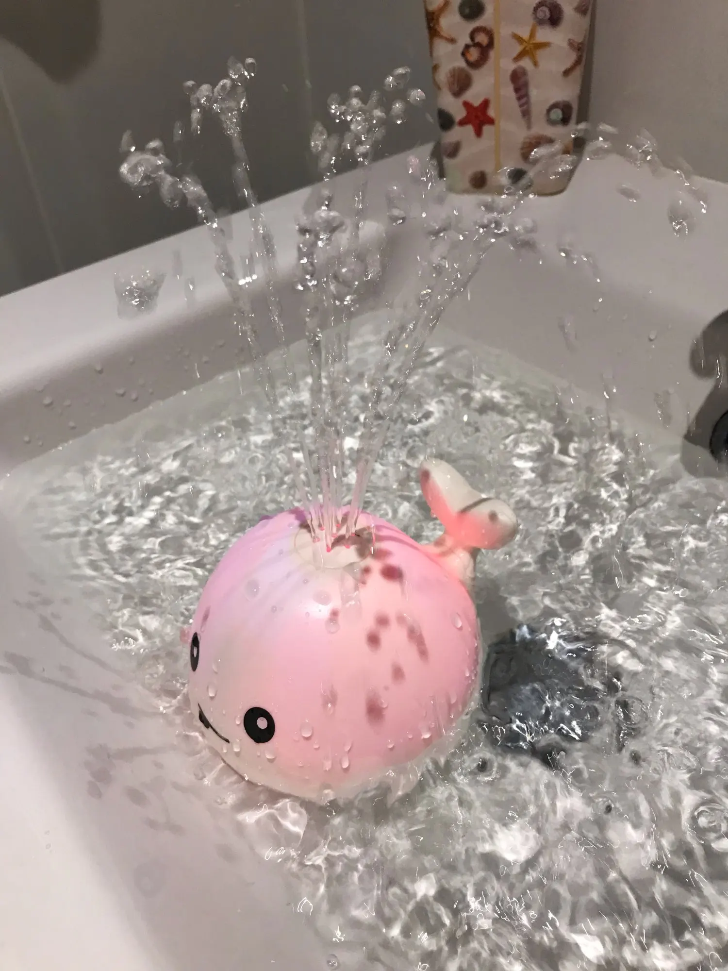 Интересная и прикольная игрушка.Батарейки вставить немного проблемно- надо откручивать винты. Работает отлично. Фонтанчик высокий,игрушка светится разными цветами, играет негромкая музыка. Включается при контакте с водой. Кнопок никаких нет. Продавца и товар РЕКОМЕНДУЮ!!!