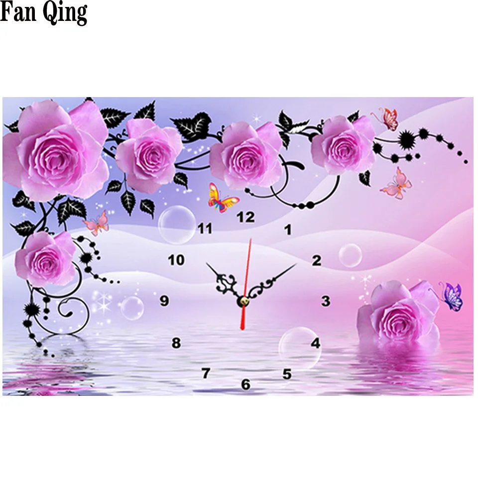 Алмазная вышивка своими руками, круглые алмазные пейзажи для гостиной, фиолетовые розы, настенные часы, алмазная живопись, вышивка крестиком, рукоделие