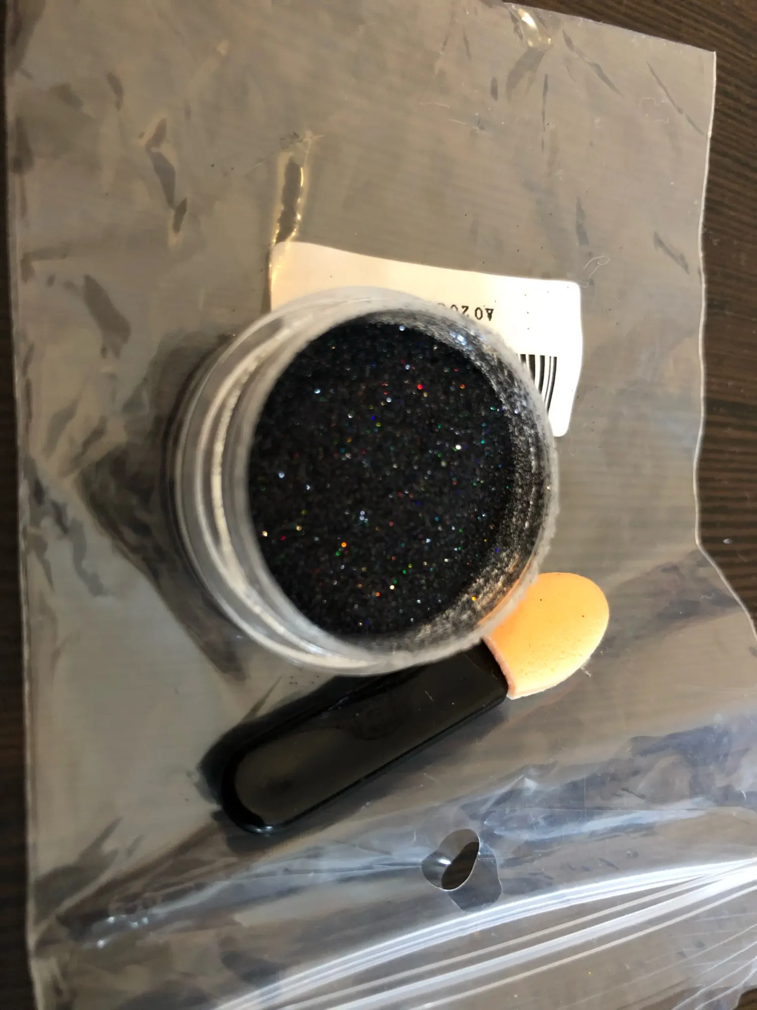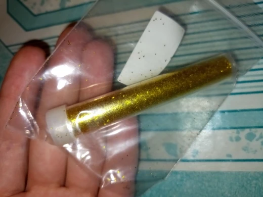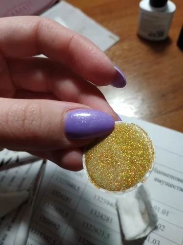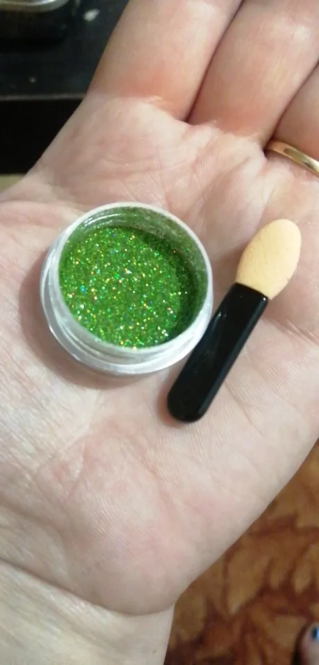 Заказ шел очень долго, с 11.11 по 21.01. Заказывала для использования в качестве блёсток, а не втирки. Продавец положил в комплект маленький спонж. Блёстки имеют зеленоватые отливы, хоть на фото продавца этого и не было четко видно, хотелось чисто золотой, но и так пойдет. Ниже прикрепляю фото, нанесла смесь топа и блёсток на черный лак, все зелёные отливы блёсток можно там увидеть. Заказывала за 30 рублей, за эту стоимость нормально. Очень понравилось, что защитную бумажку можно аккуратно снять щипчиками, а потом положить сверху на баночку в качестве дополнительной защиты под крышкой, рвать и резать ничего не пришлось.