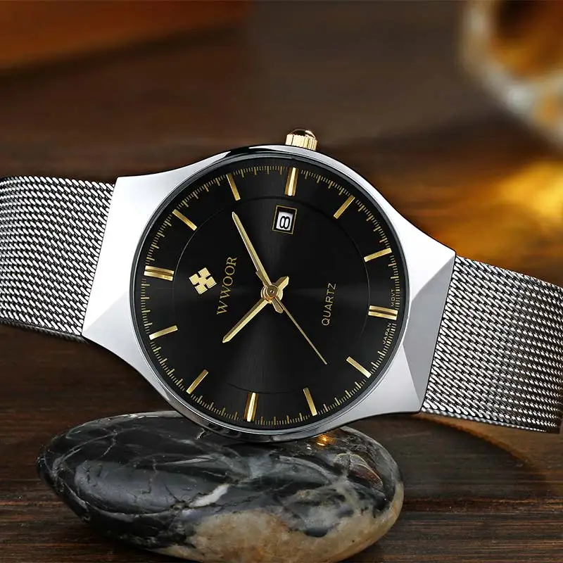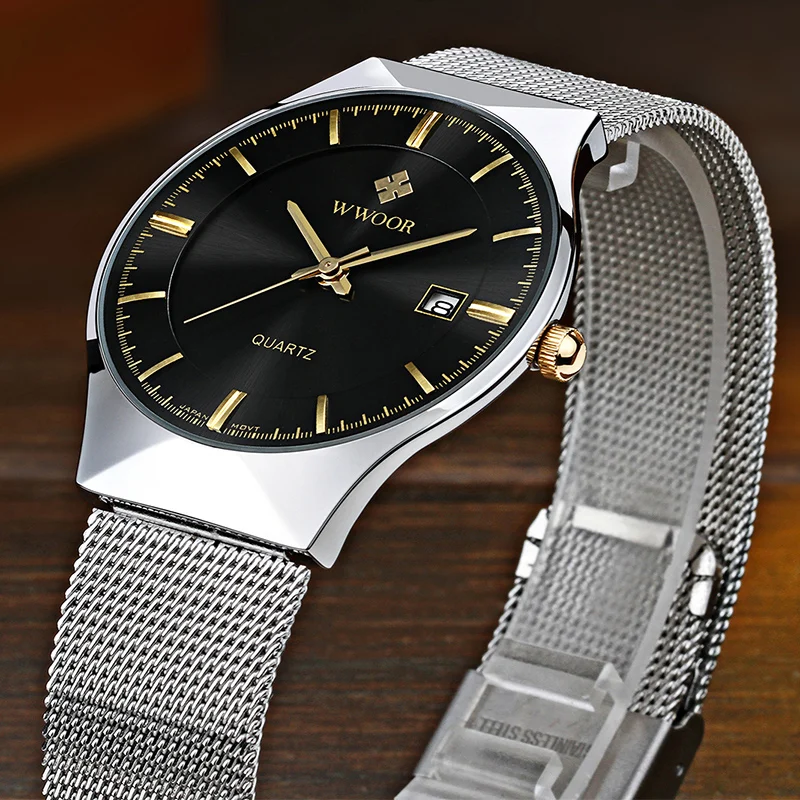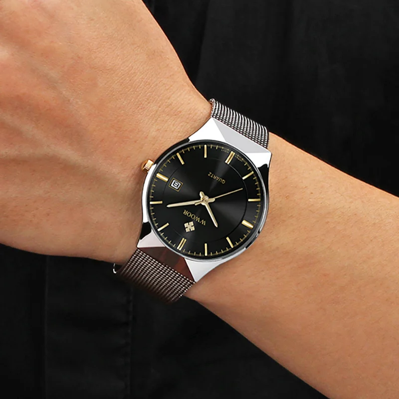 Часы WWOOR Мужские кварцевые ультратонкие, модные черные роскошные минималистичные повседневные водонепроницаемые, 2020