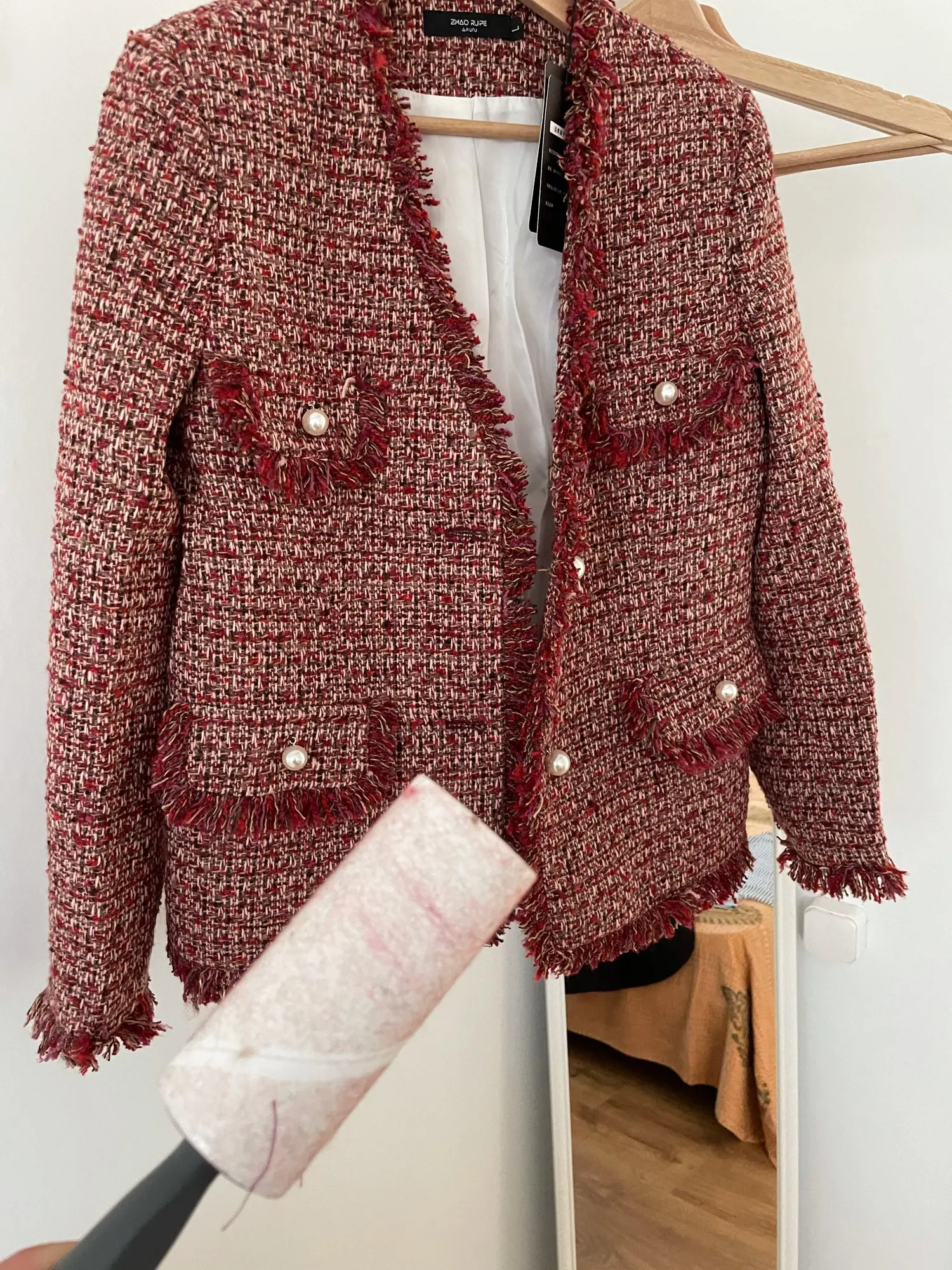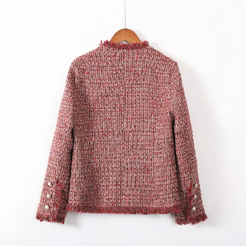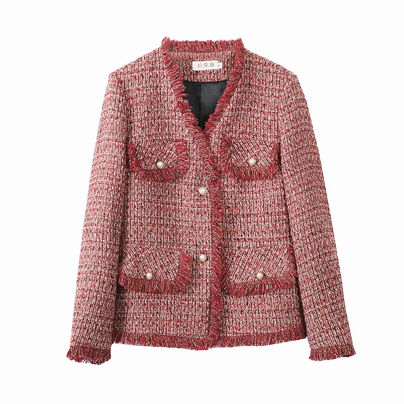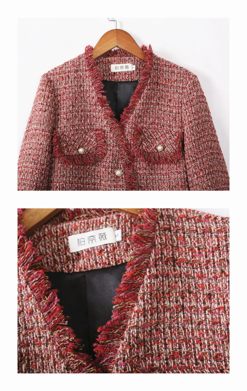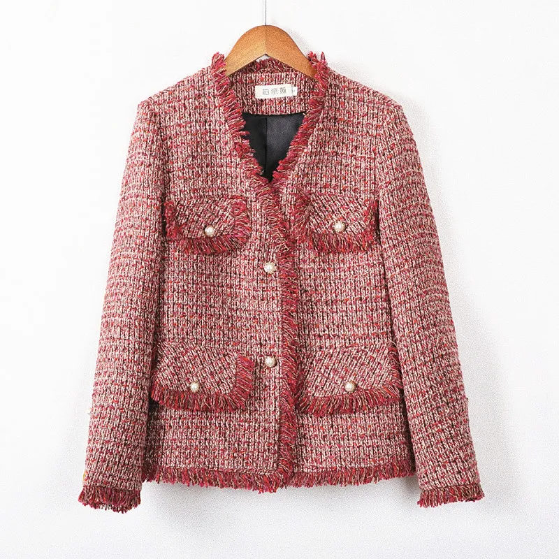 Женская твидовая куртка, красная однобортная куртка с бахромой, длинным рукавом и V-образным вырезом, весна 2020