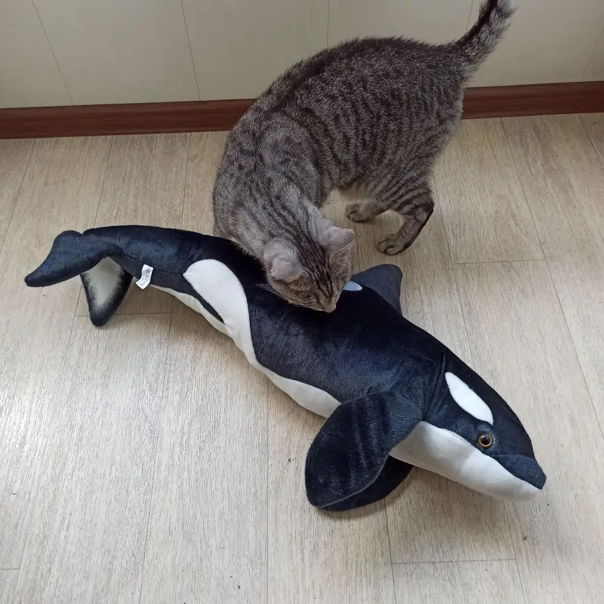 Касатка большая, хорошая, но лишь с виду, пока не прикоснешься. Сверху некое подобие плюша на основе жёсткой синтетики типа нейлона, наверное. В общем прикасаться неприятно. Руки потом чесались весь день. Жаль выглядит красиво - трогать нельзя. Кстати, не рекомендую для людей с чувствительной кожей, или тем более детей, и лучше рядом с ней не вдыхать, а то частицы нейлона очень сильный раздражитель. Открыл спор, сказали вернуть товар, но заплатить за доставку. Доставка стоит столько же.... В итоге отдал 2700 за "экспонат".