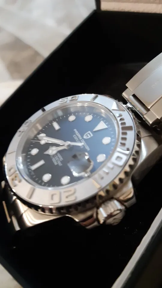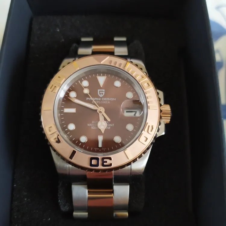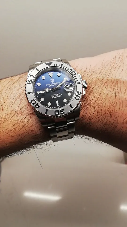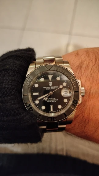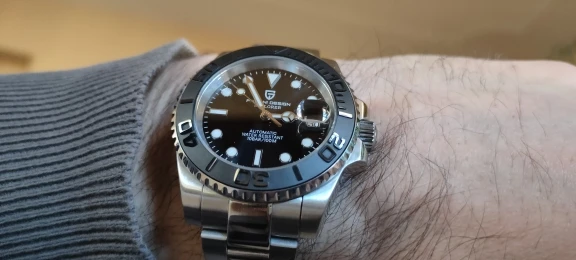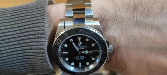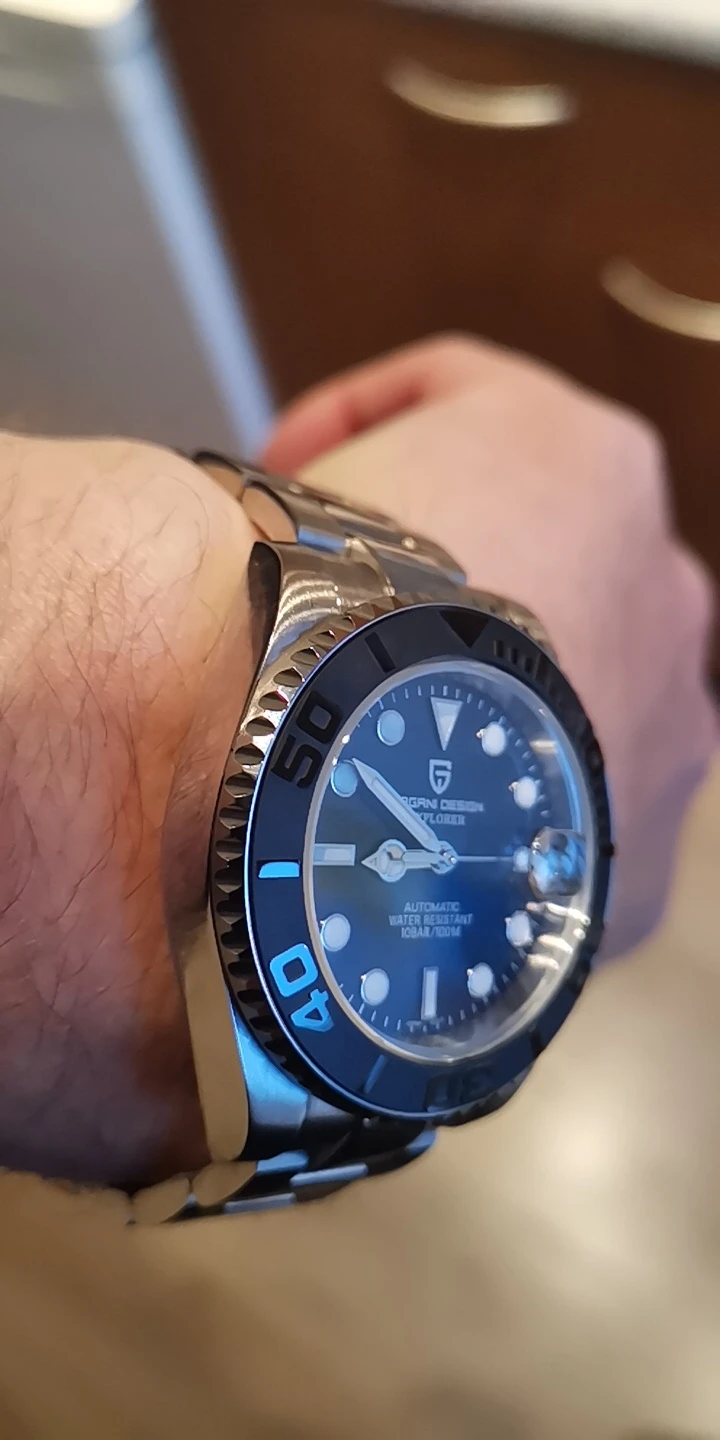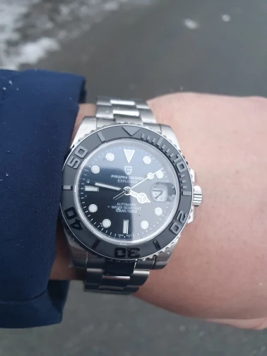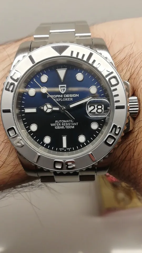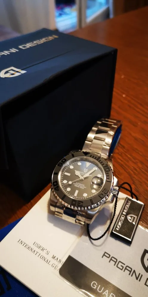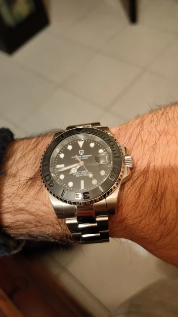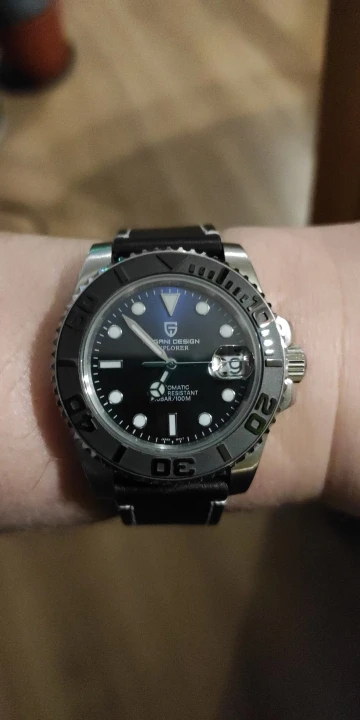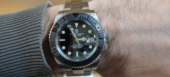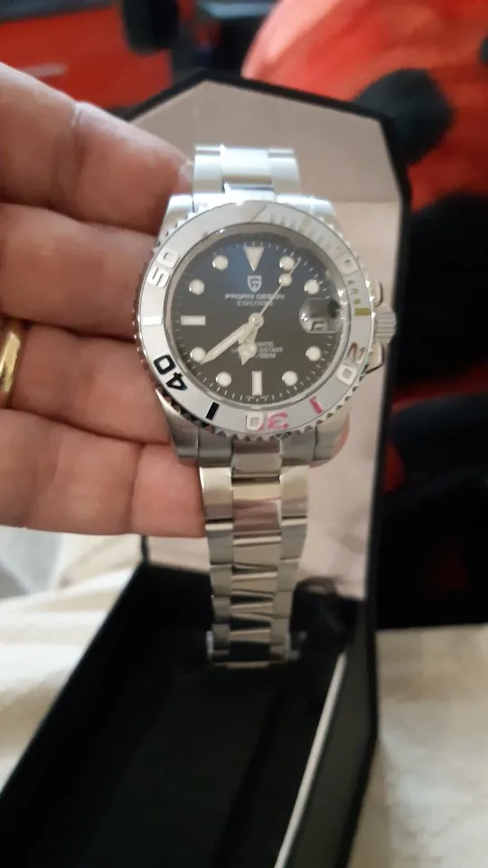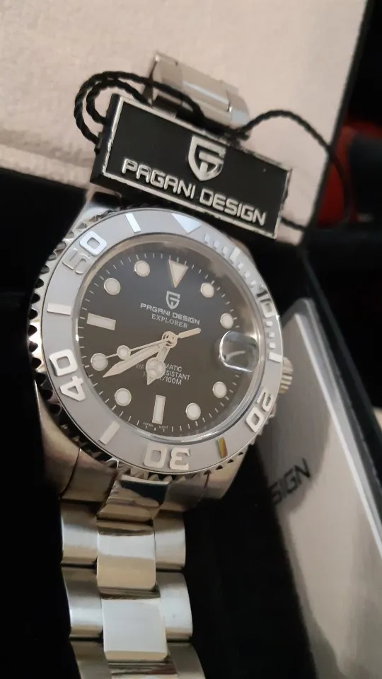 Отличные автоматические часы от Pagani, удивительное детальное почтение до подмаринера Ролекс на основе. Доставка была хорошей около 3 недель и была доставлена неповрежденной. Часы имеют хороший вес, ощущаются на запястье, Резиновая лента безопасна. Я надеюсь, что Pagani разработает Специальный выпуск черного стального корпуса и ремешка с серым или белым лицом. Все работает так, как должно быть, не болтается и не ржавеет. Это первый Pagani, который я владею и с тех пор покупаю золото с черным циферблатом на стальном браслете.