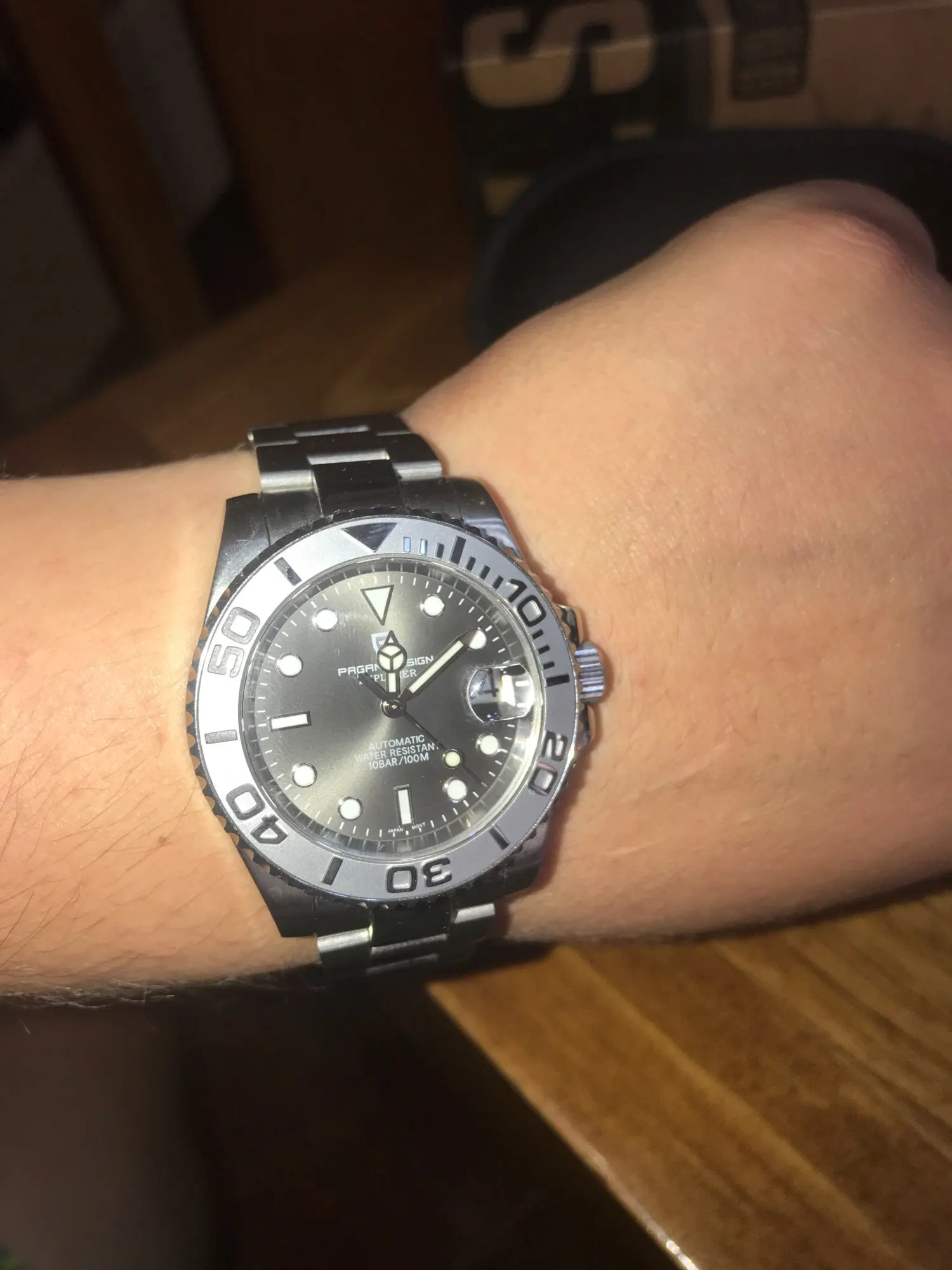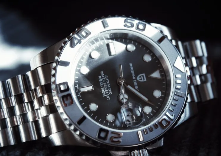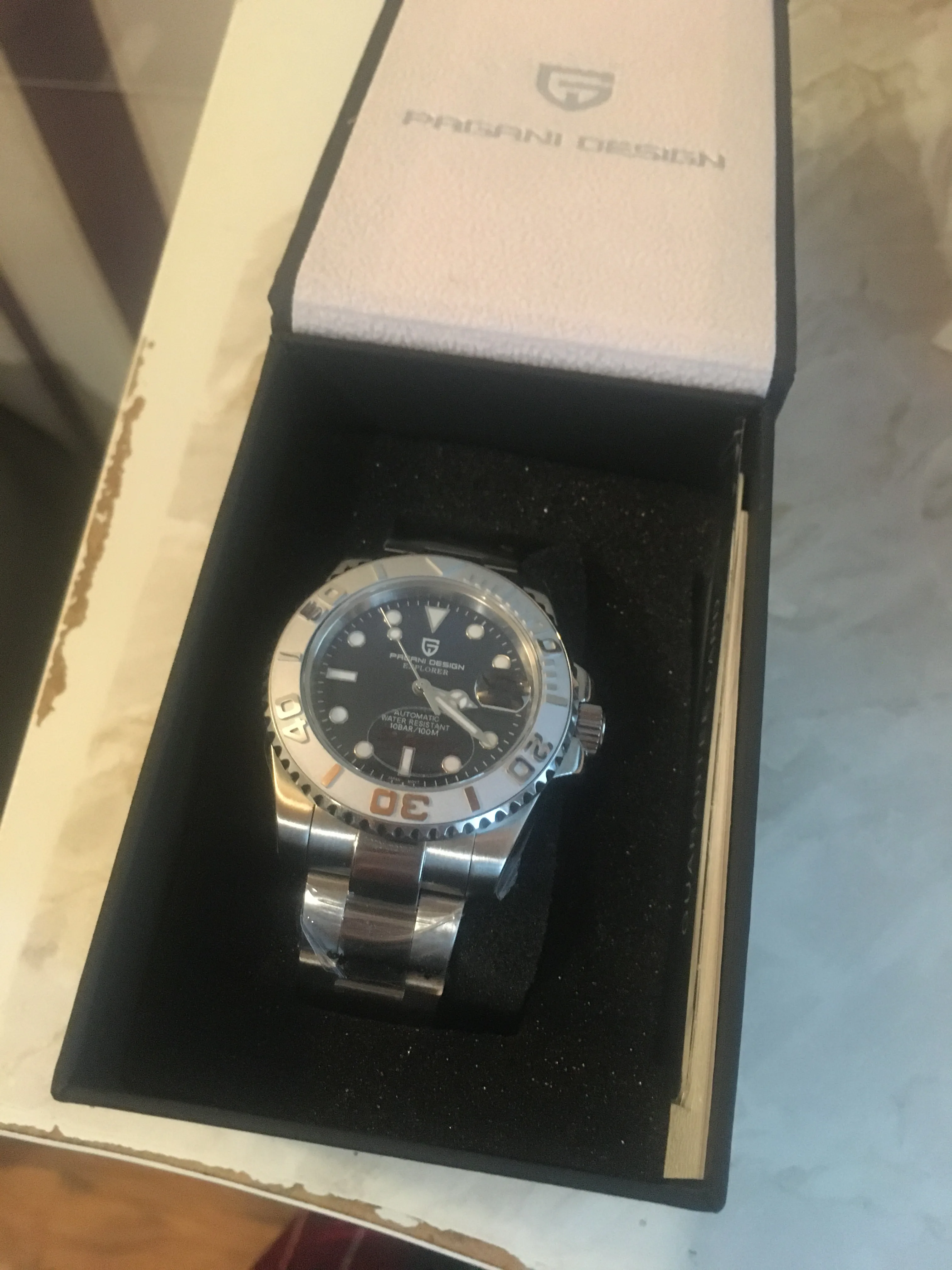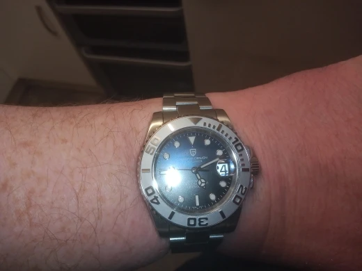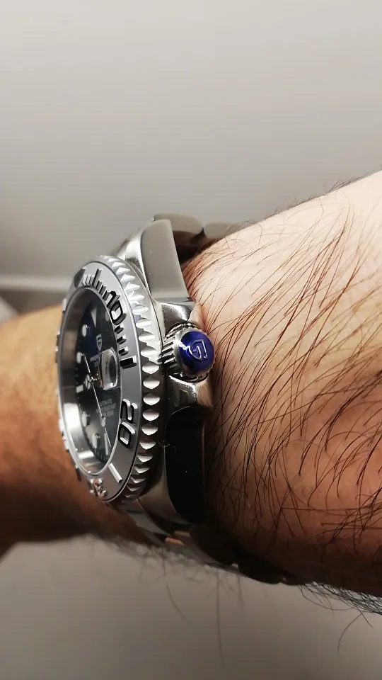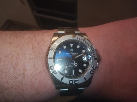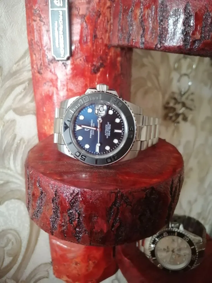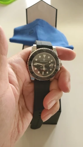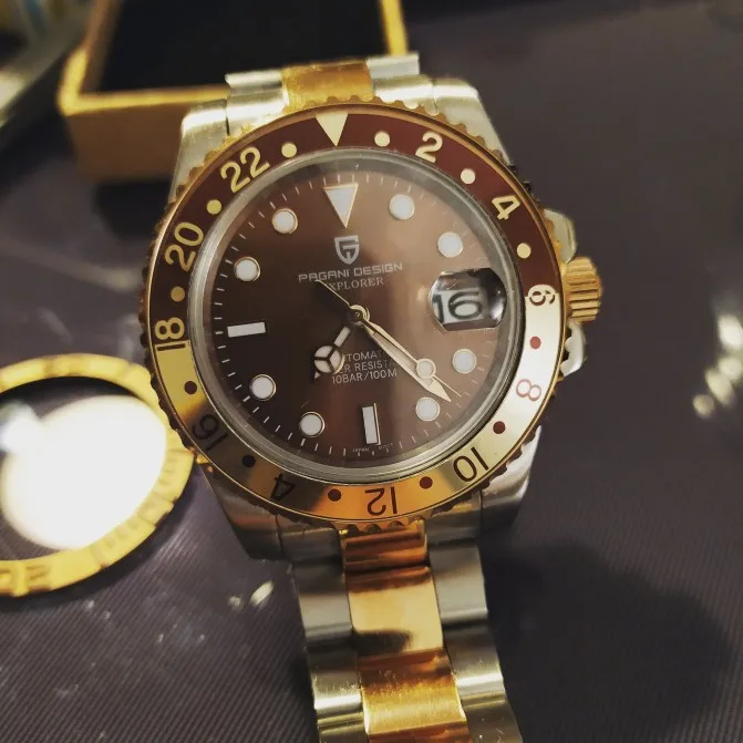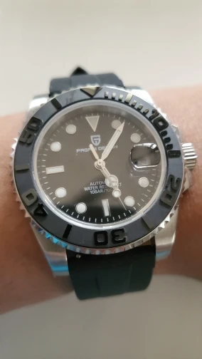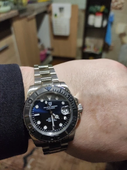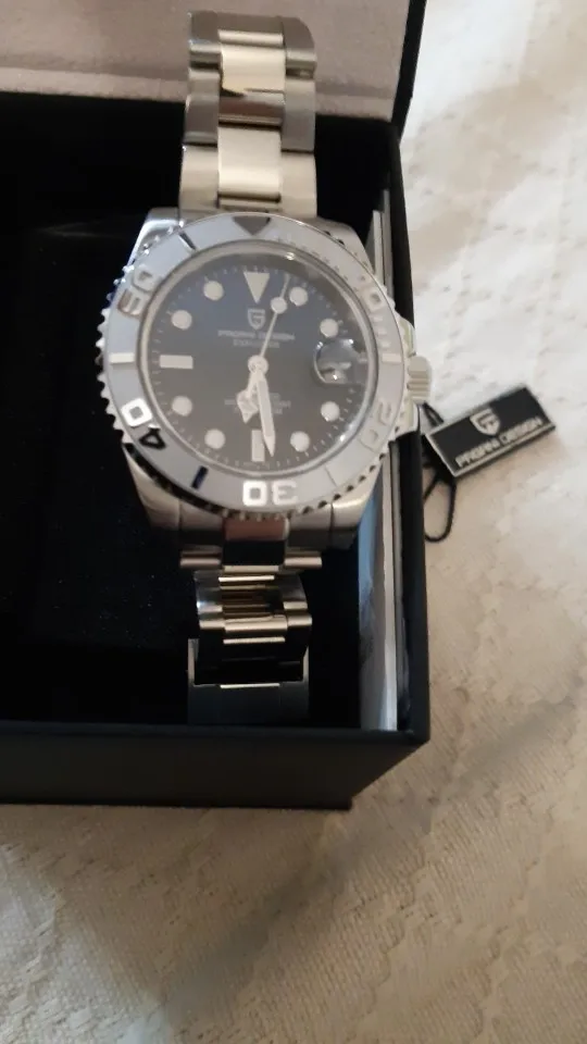 Отличные автоматические часы от Pagani, удивительное детальное почтение до подмаринера Ролекс на основе. Доставка была хорошей около 3 недель и была доставлена неповрежденной. Часы имеют хороший вес, ощущаются на запястье, Резиновая лента безопасна. Я надеюсь, что Pagani разработает Специальный выпуск черного стального корпуса и ремешка с серым или белым лицом. Все работает так, как должно быть, не болтается и не ржавеет. Это первый Pagani, который я владею и с тех пор покупаю золото с черным циферблатом на стальном браслете.