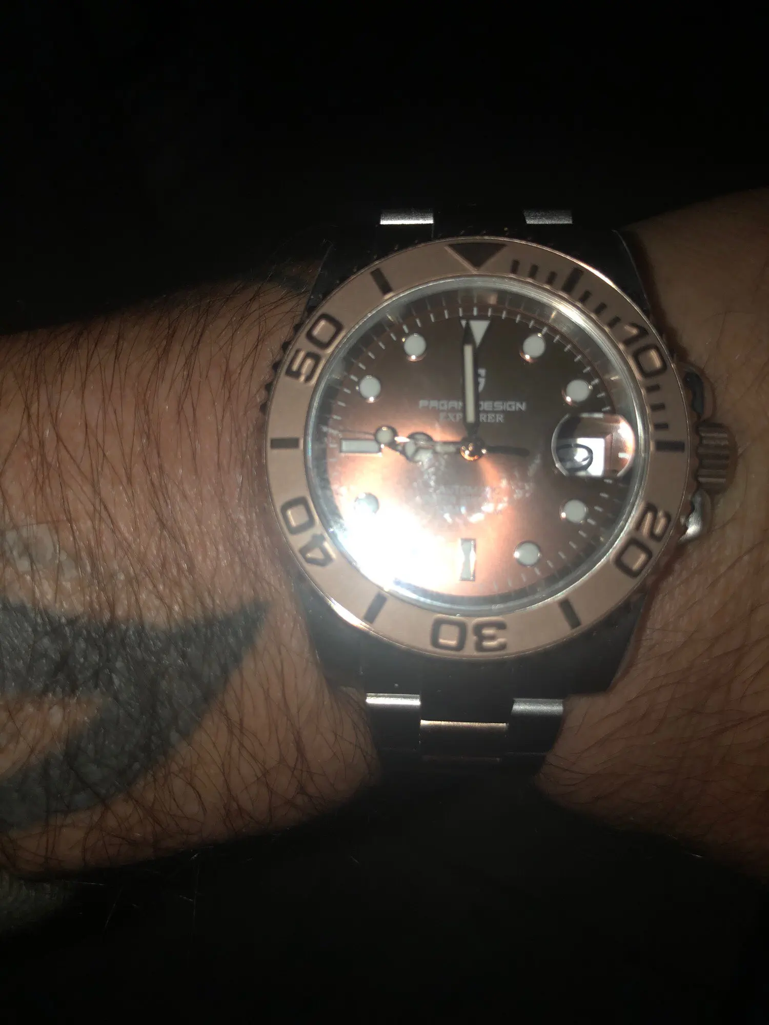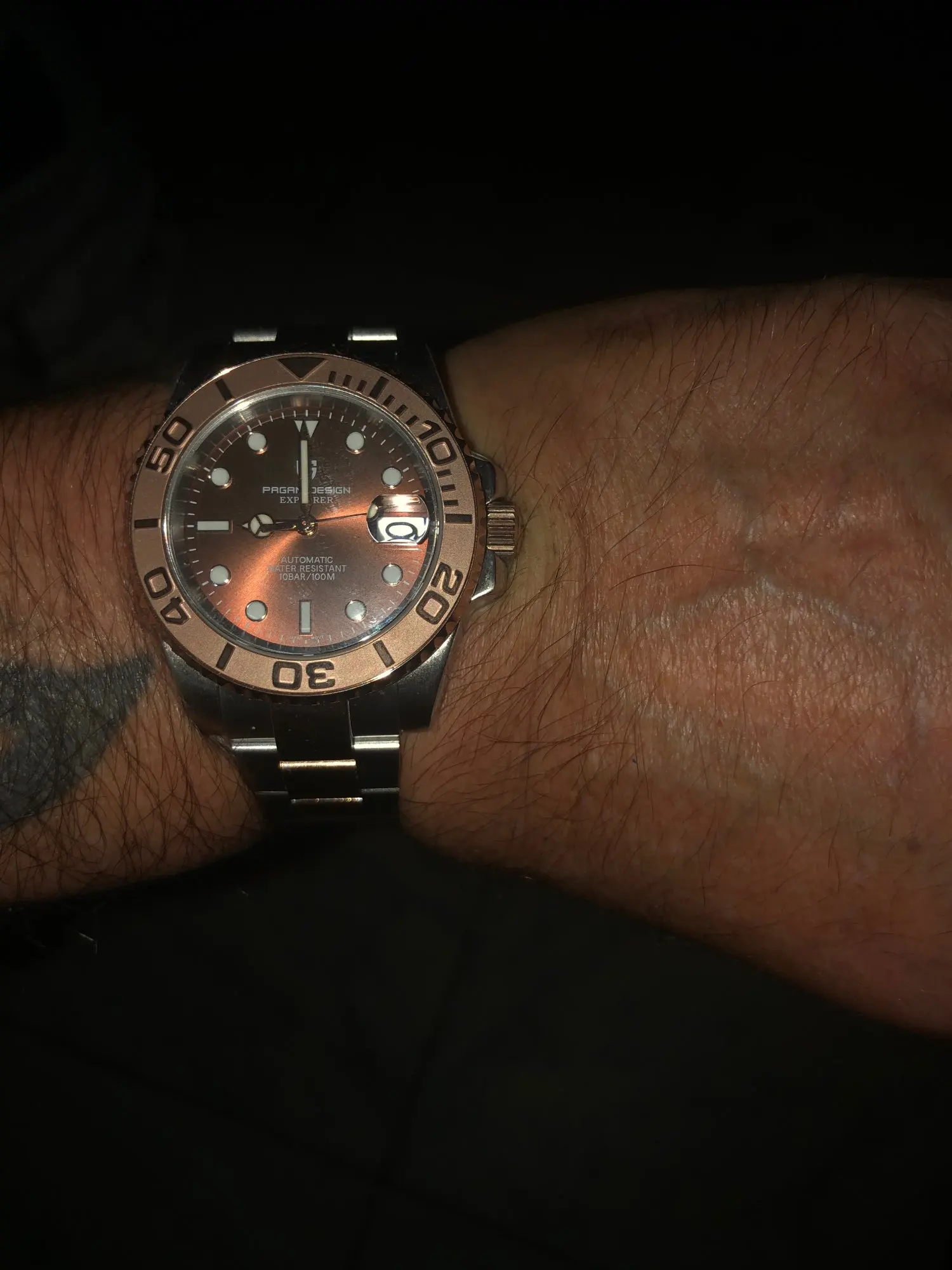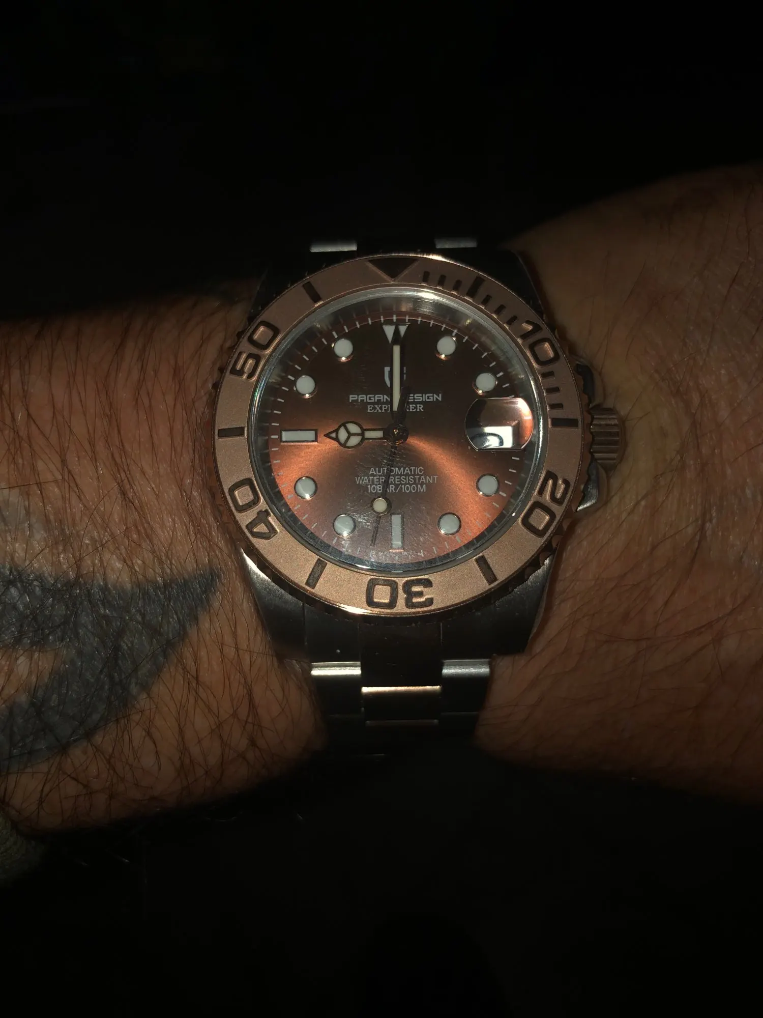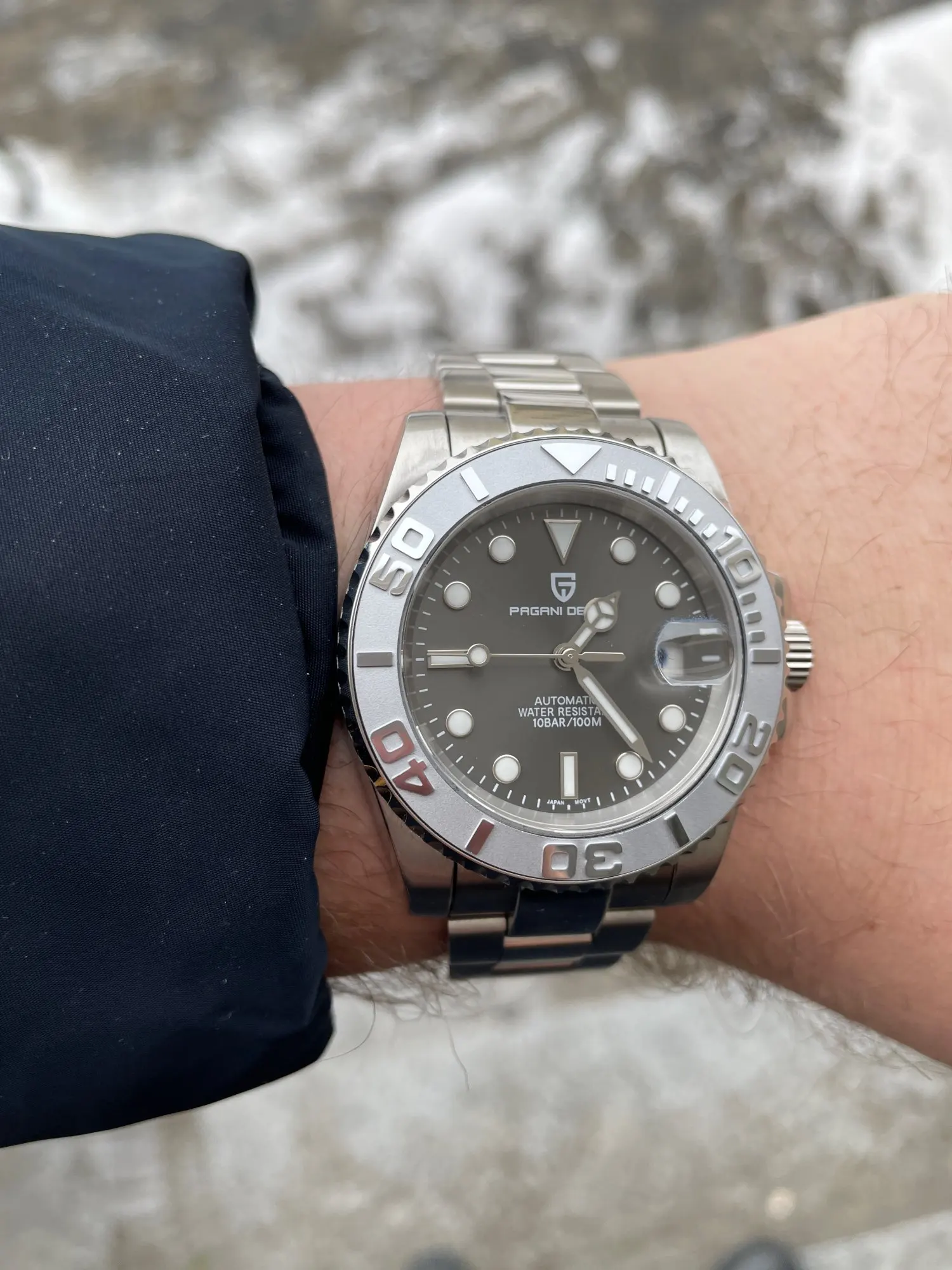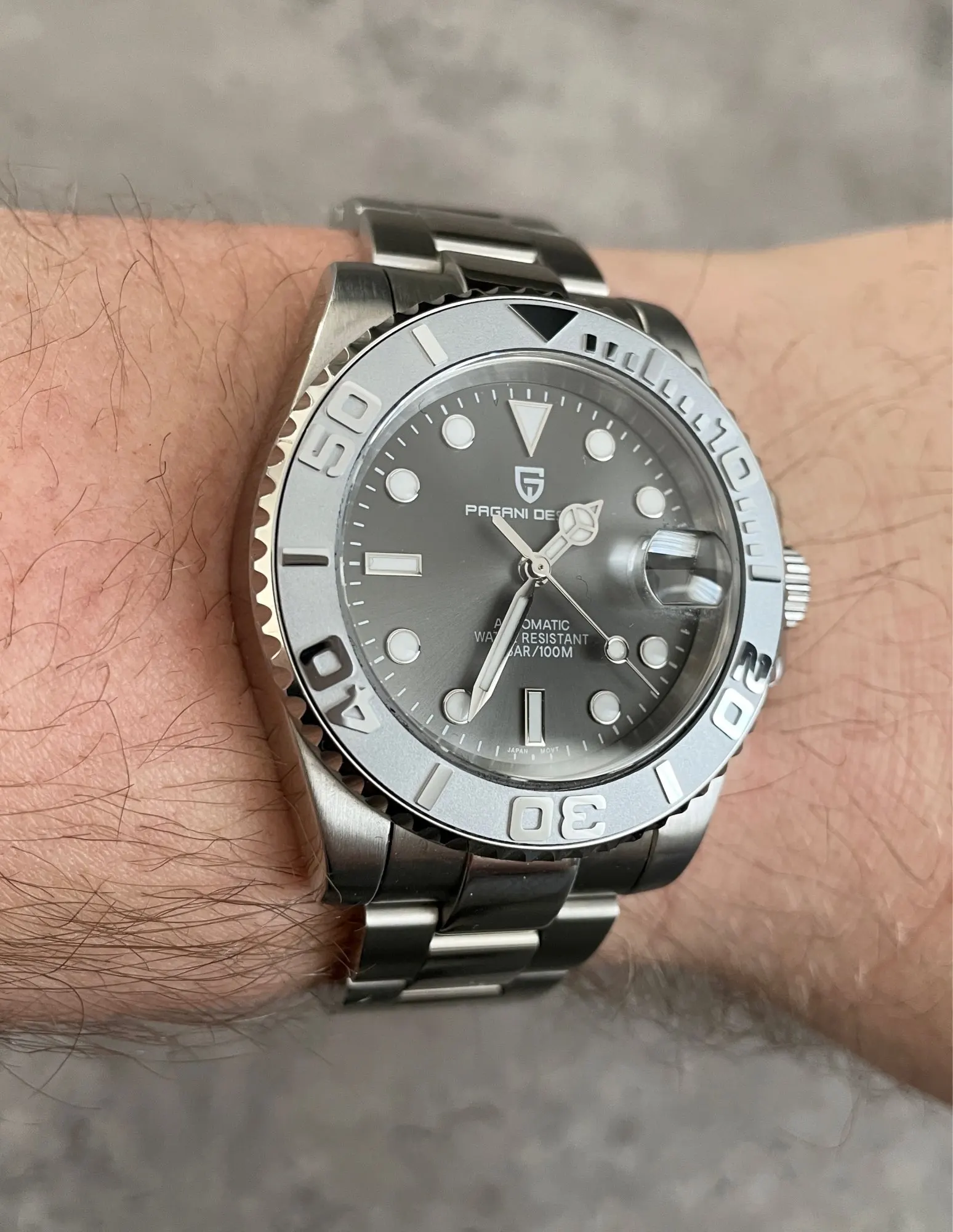 Отличные автоматические часы от Pagani, удивительное детальное почтение до подмаринера Ролекс на основе. Доставка была хорошей около 3 недель и была доставлена неповрежденной. Часы имеют хороший вес, ощущаются на запястье, Резиновая лента безопасна. Я надеюсь, что Pagani разработает Специальный выпуск черного стального корпуса и ремешка с серым или белым лицом. Все работает так, как должно быть, не болтается и не ржавеет. Это первый Pagani, который я владею и с тех пор покупаю золото с черным циферблатом на стальном браслете.