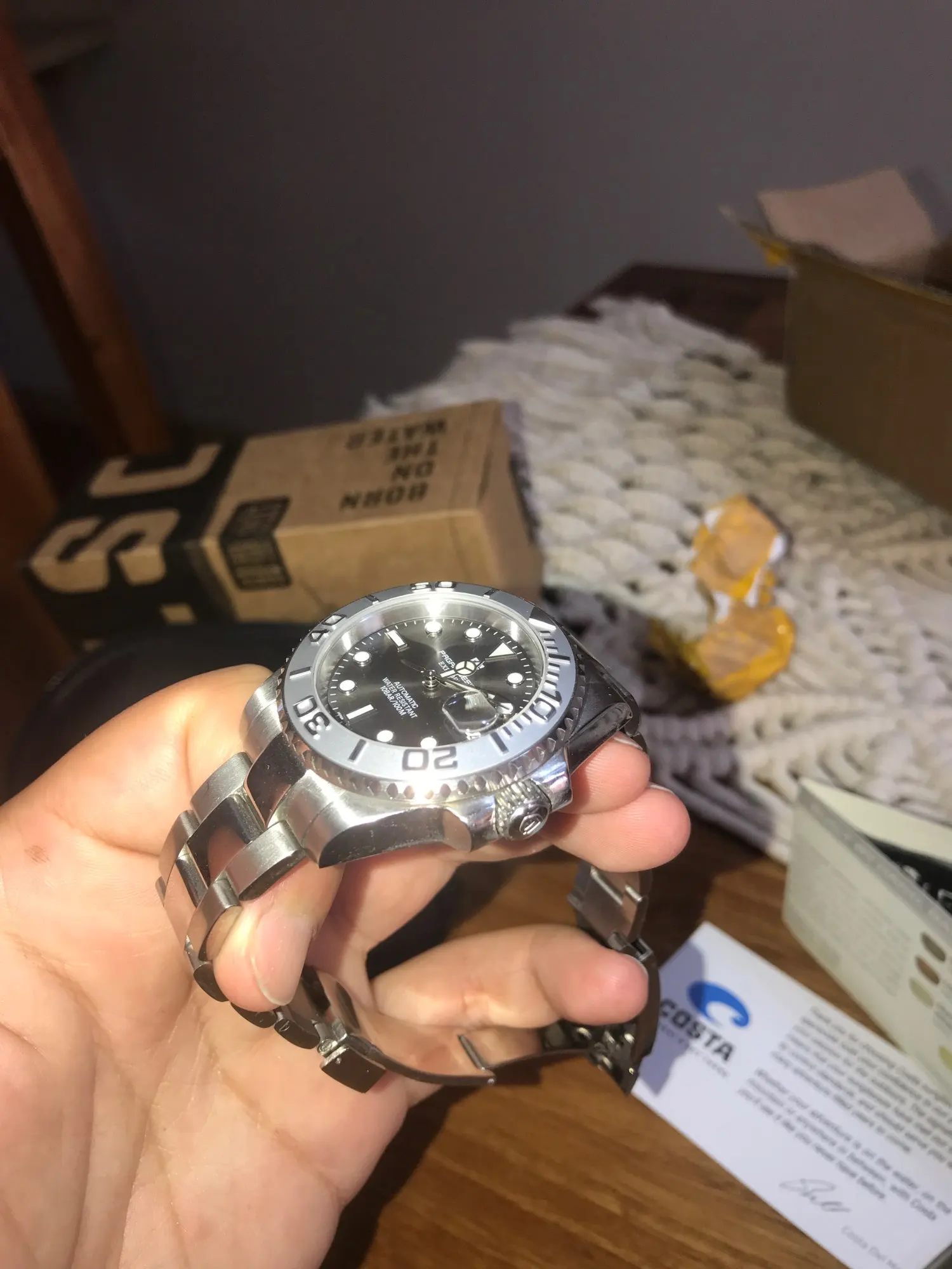 Супер быстро! Часы сделаны хорошо, seiko movement NH35A, милые прочные. Браслет немного дешевый, отделка Великолепная, но немного резкий, для того, что стоит, хотя и выгодная покупка. Я обновлю обзор после нескольких месяцев использования.