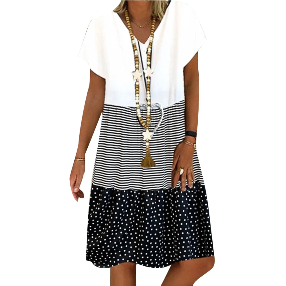Женское платье в стиле бохо, с V-образным вырезом, в горошек, свободное, до колен, Пляжное, праздвечерние, Пляжное, в полоску с коротким рукавом