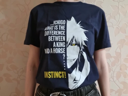 Доставка в РФ быстрая,качество хлопок,пошита аккуратно,нитки не торчат.Принт яркий,выполнен как аппликация.На девушку 42 размера S как раз чуть оверсайз.Все отлично,спасибо за такой интересный принт,эта фраза одна из важных в контексте сюжета аниме Блич.)))