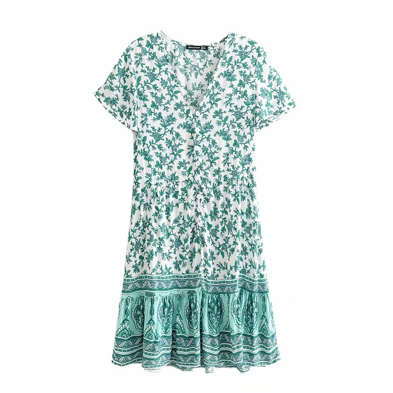 Женское мини-платье с цветочным принтом, глубоким V-образным вырезом и коротким рукавом