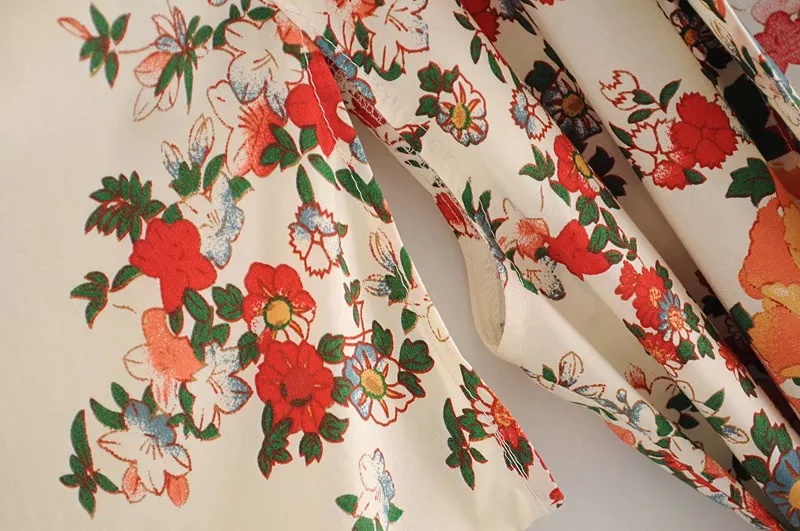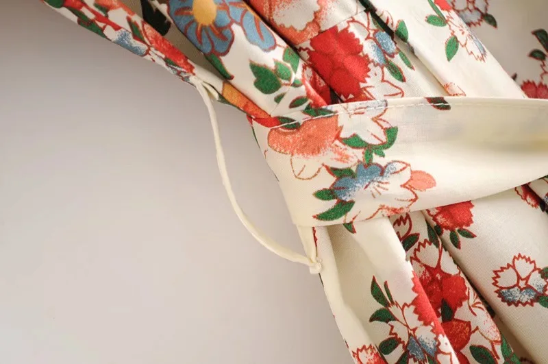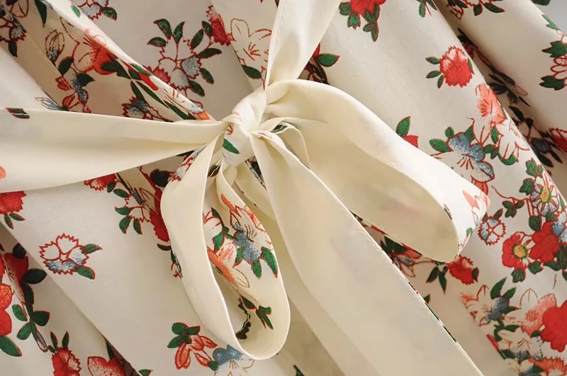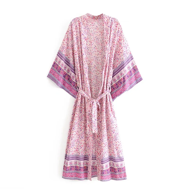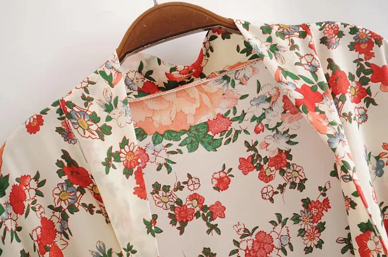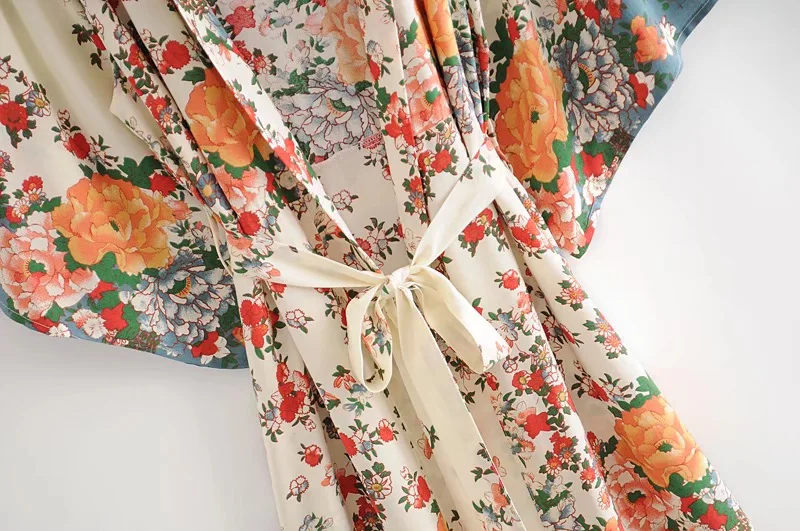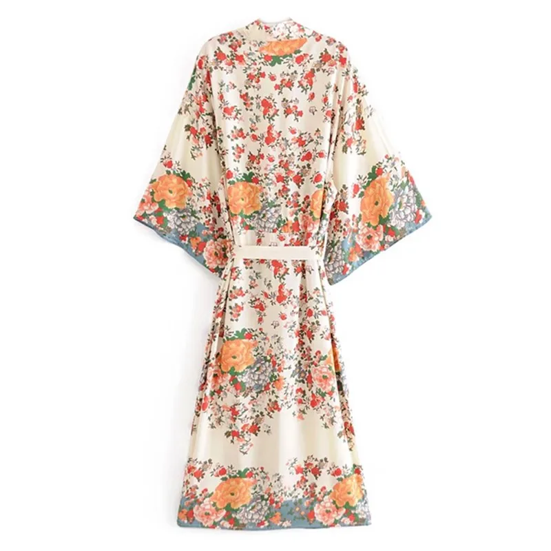 Рубашка-кимоно Женская в стиле бохо, длинный кардиган с цветочным принтом, в стиле хиппи, на завязках, с поясом-бантом, свободная Праздничная блузка, бежевый цвет