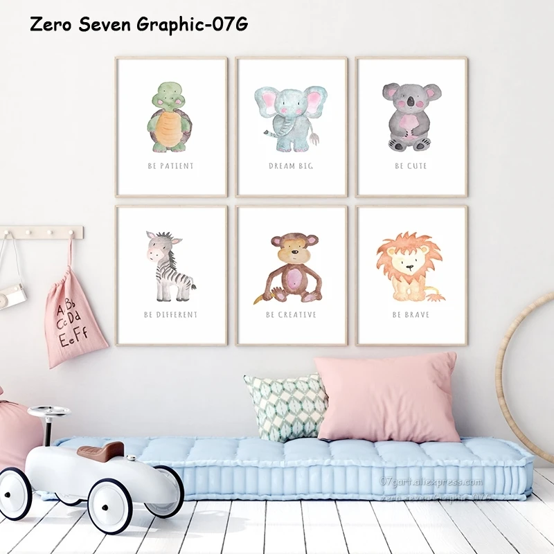 Милый акварельный лес Животное Мультфильм Лев коала Тигр вдохновляющие фотографии холст печать плакат для украшения детской комнаты