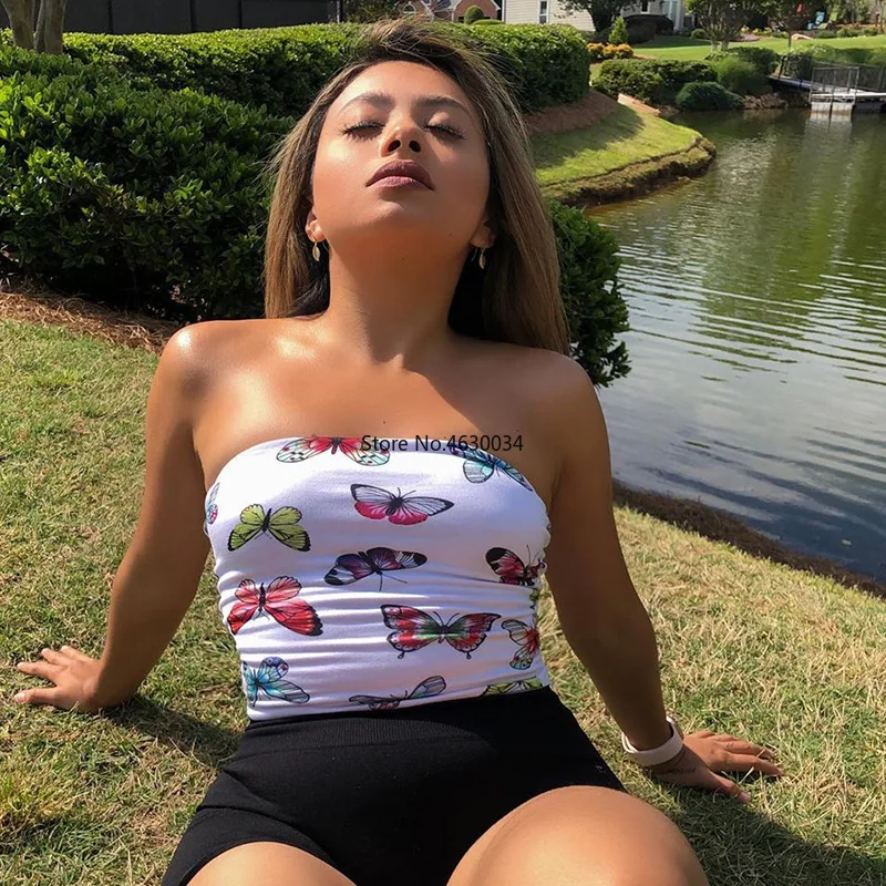 Женский укороченный Топ без бретелек с принтом бабочки и открытыми плечами на лето 2020