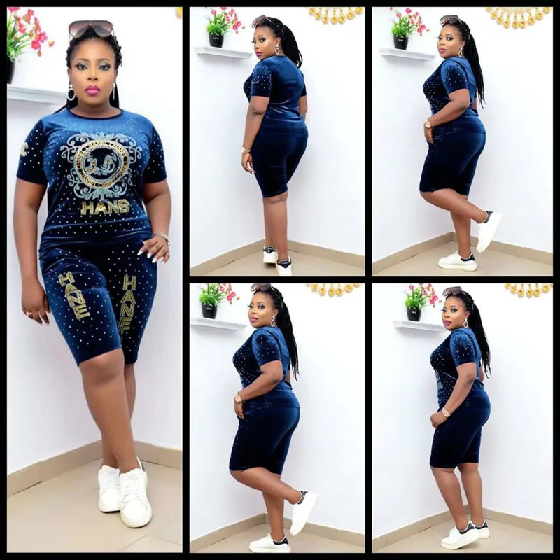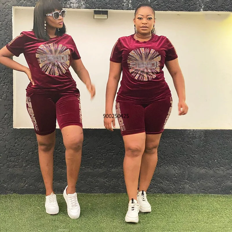 2021 размера плюс комплект из 2 предметов, женский спортивный костюм, повседневная бархатная футболка с надписью и бриллиантами, костюм с шортами, знаменитые наряды, костюм для подвижных игр
