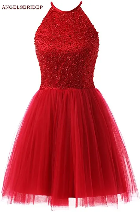ANGELSBRIDEPКороткие платья для выпускного вечера с высоким воротом, Vestidos de festa, сексуальное платье с открытой спиной, вышитое бисером, фатиновое вечернее платье на выпускной