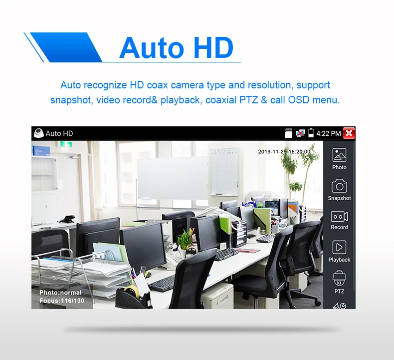● HD-SDI тест, 1920x1080P 25/30/50/60 кадров в секунду, 4xzoom, видео запись и воспроизведение, коаксиальный PTZ и вызова OSD меню