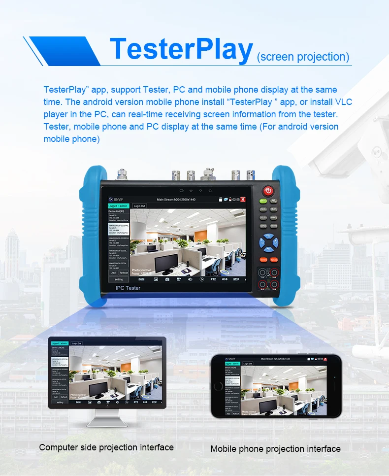 ● Воспроизведение тестера: тестер, мобильный телефон версии android и дисплей ПК одновременно