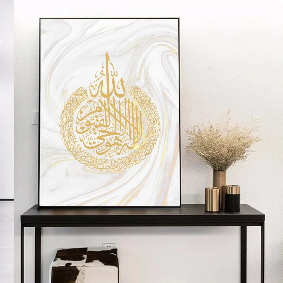 Золотистый мрамор Ayatul Kursi арабская каллиграфия исламское настенное Искусство Холст Картина, печатный плакат картины для гостиной домашний декор