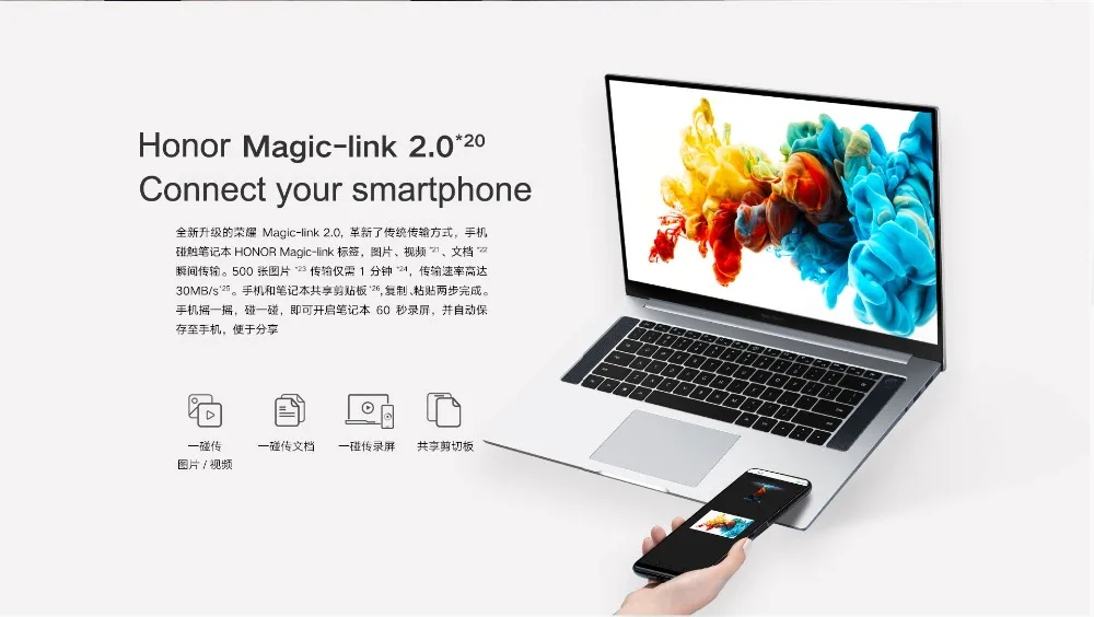 5) его можно адаптировать к смартфону через режим подключения Magic-Link 2,0. Его можно легко подключить к телефону через ключницу компьютера Huawei. Скорость передачи данных между ними может достигать 1 Гбит/мин. Можно выполнить автоматическое резервное копирование.