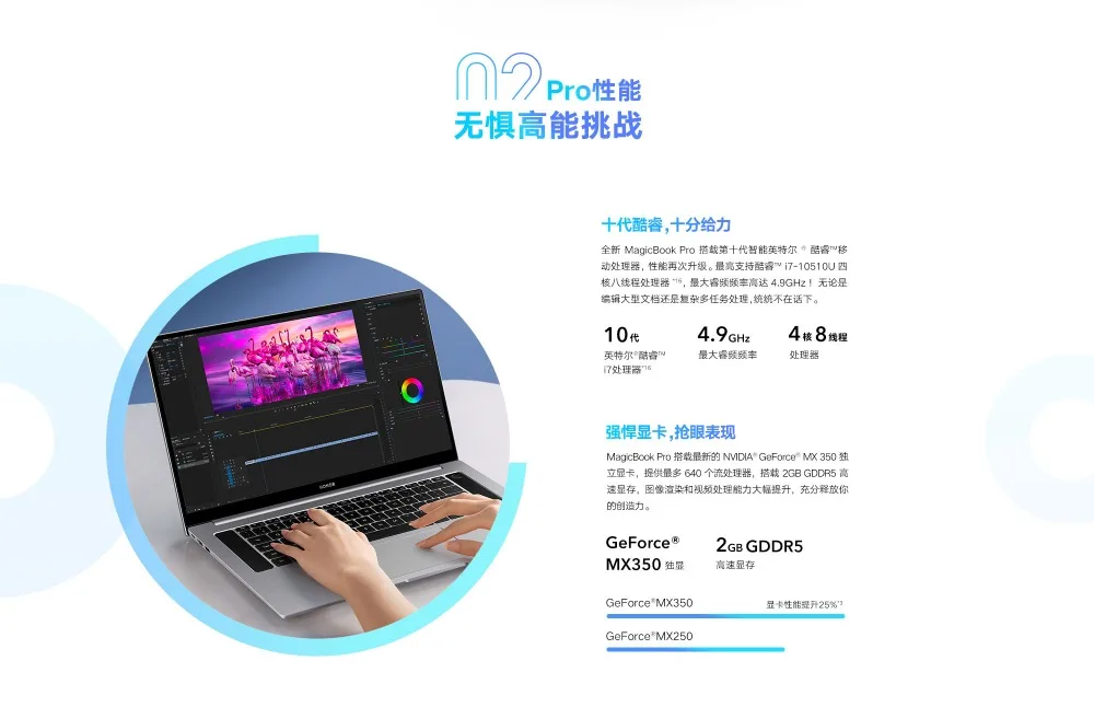 Honor MagicBook Pro поставляется с 16,1 дюймовым полноэкранным дисплеем, соотношением сторон 16:9 и соотношением сторон 90 процентов. Панель работает на разрешении 1920 × 1080 пикселей. Под блендой устройство оснащено процессором Intel Core i7-10510U 10-го поколения. Утверждается, что SoC на 40 процентов быстрее своего предшественника. Процессор подкреплен новейшимиДискретная Графика NVIDIA GeForce MX350.