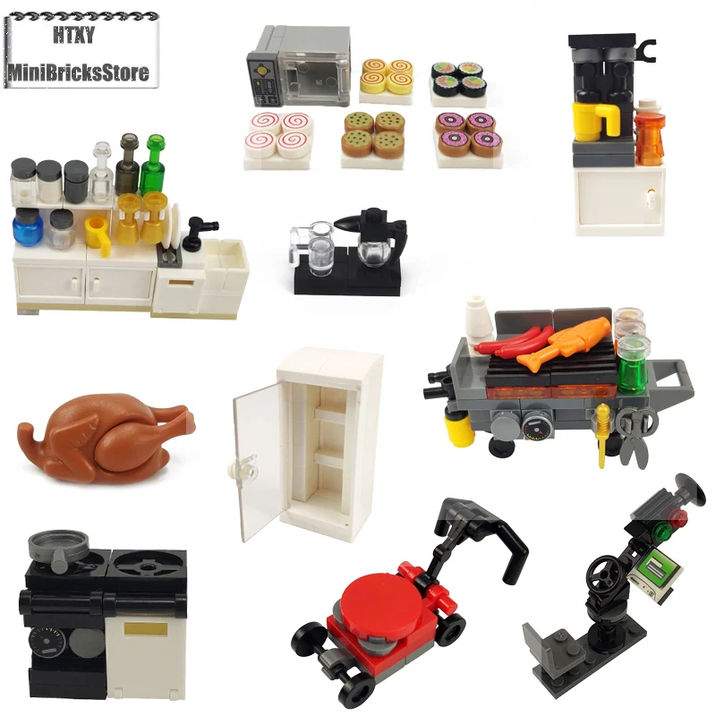 Игрушечные строительные блоки, аксессуары MOC, совместимы с кухонными инструментами, СВЧ-гриль, стойки, детские подарки, играйте с друзьями