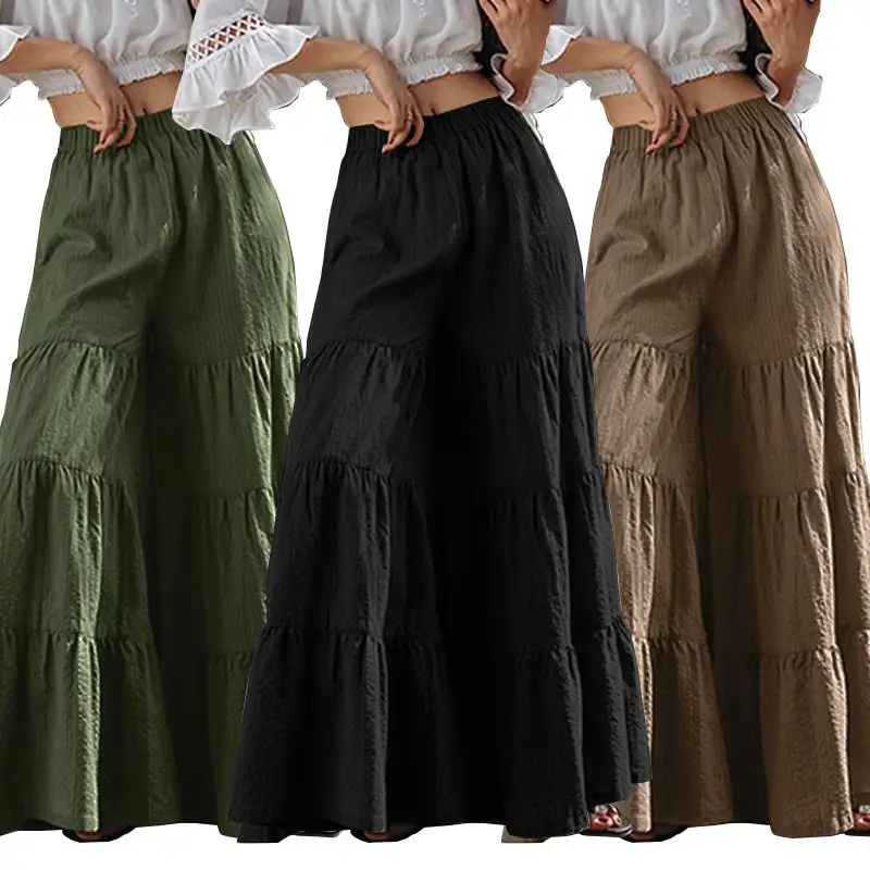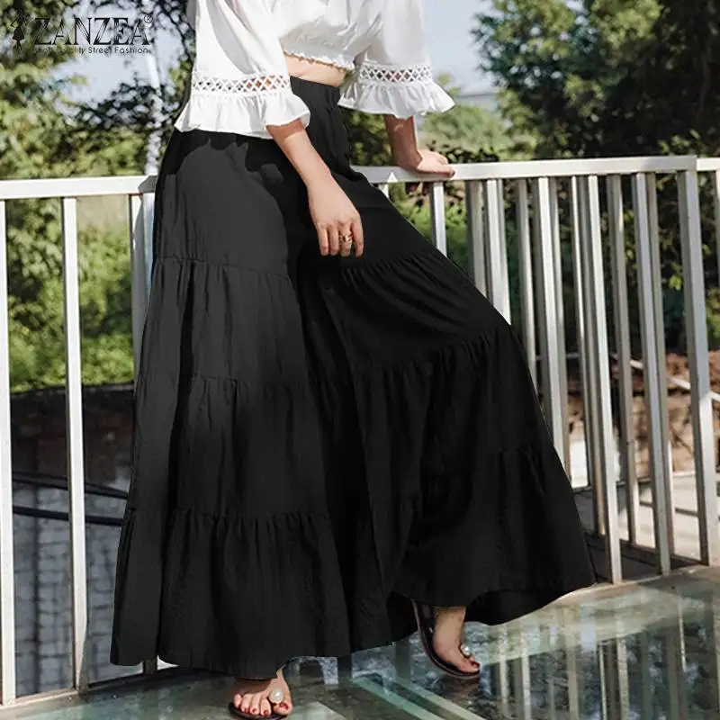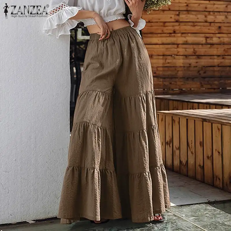 Брюки женские ZANZEA, широкие, с рюшами, 2021, женские, палаццо, большие размеры, однотонные, повседневные, репсовые, штаны с эластичным поясом