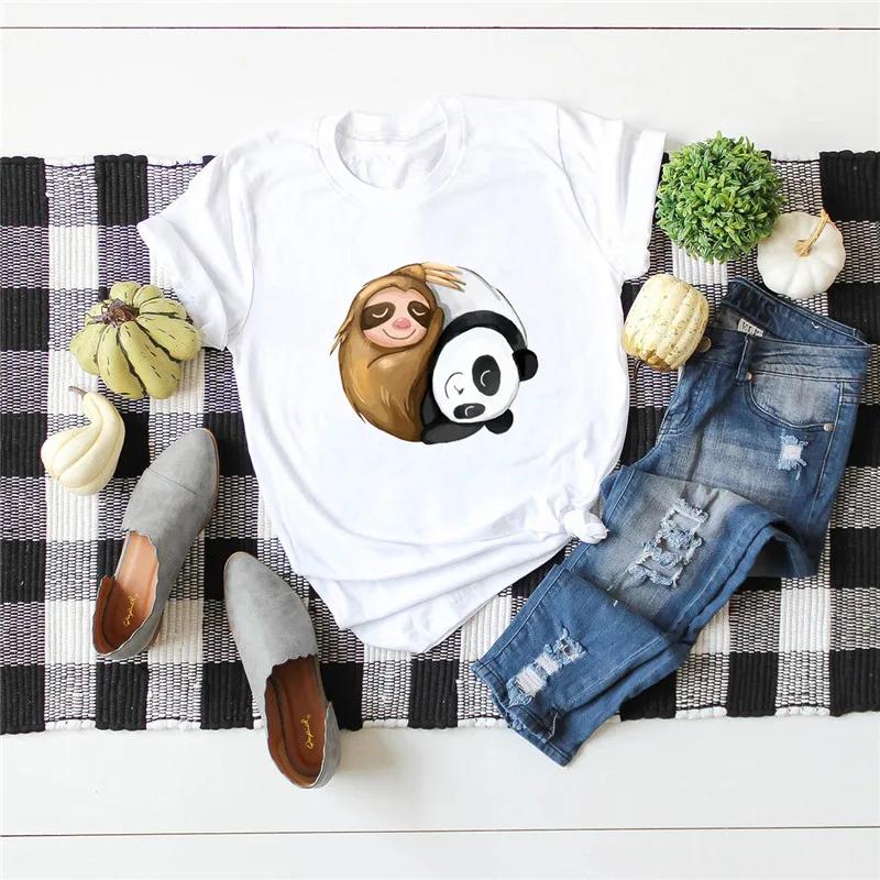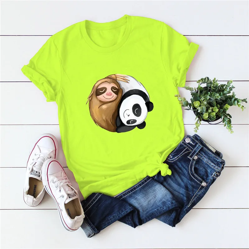 Футболка женская из размера плюс-S-5XL хлопка, с принтом ленивца и панды, с круглым вырезом и коротким рукавом, розовые топы, лето, 100%