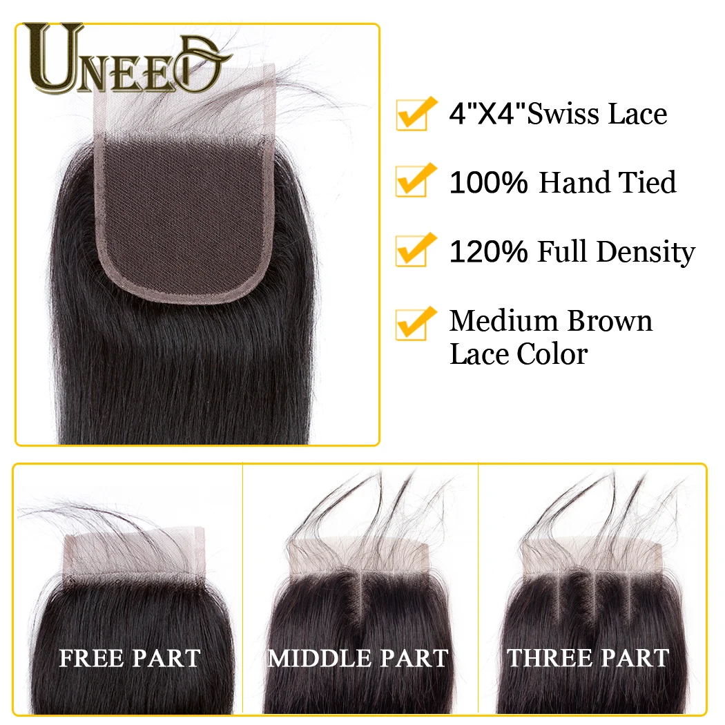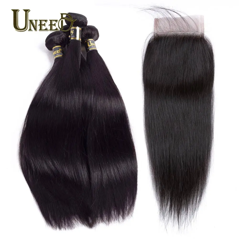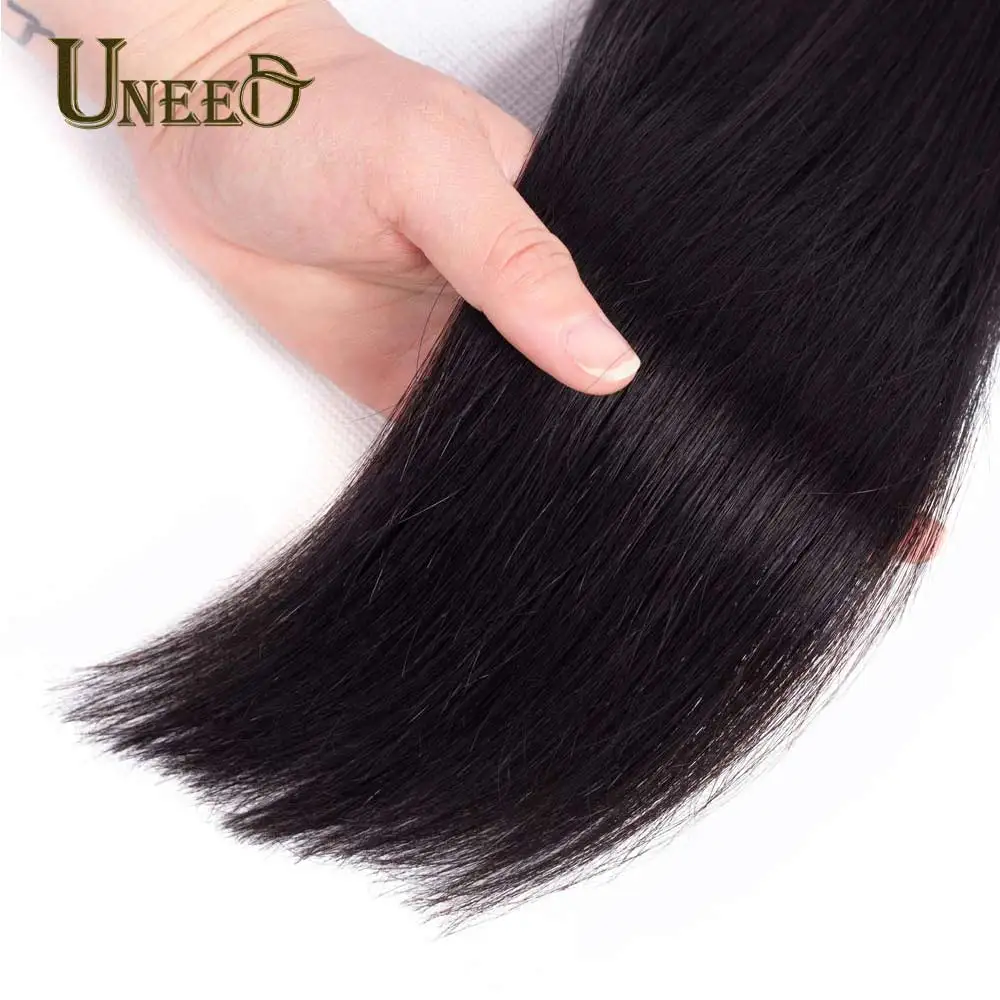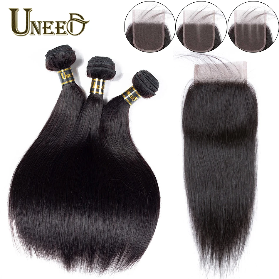 Uneed пряди волос с закрытием бразильские прямые волосы плетение 34 пряди с закрытием Remy 100% человеческие волосы для наращивания 8-26 дюймов