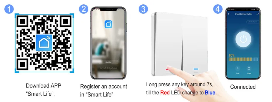1. Загрузите приложение Smart Life, зарегистрируйте учетную запись и Войдите в систему2. Нажмите «+» в правом верхнем углу-Добавьте вручную-электрик-переключатель (Wi-Fi).3. Долго нажимайте любую клавишу около 7s, пока красный светодиодный индикатор не изменится на синий.4. Нажмите «Подтвердить светильник быстро мигает ", а затем введите правильный пароль Wi-Fi (2,4 ГГц Wi-Fi)5. В течение 30 секунд, он будет подключен.