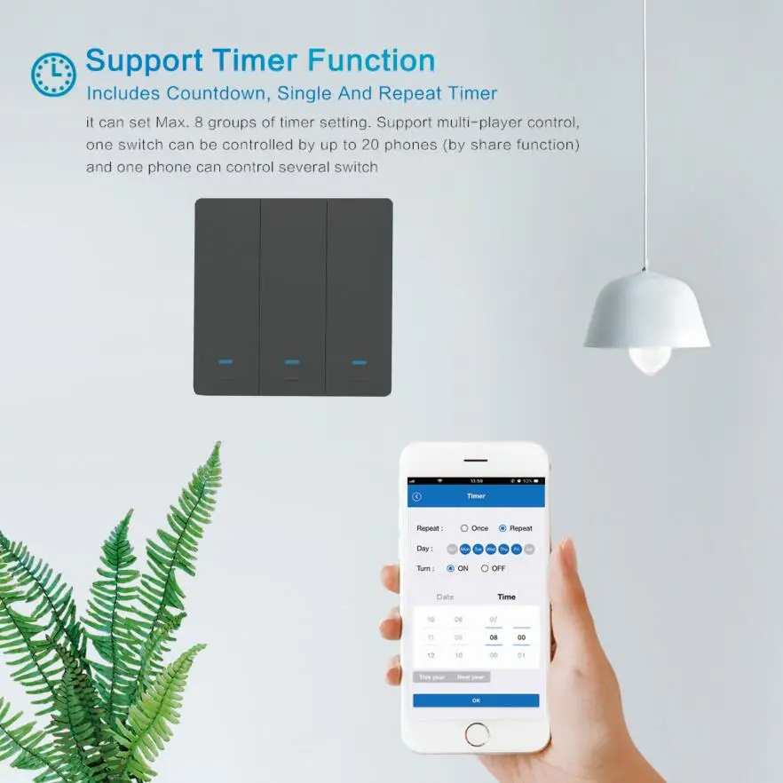 Характеристики:Широкий диапазон питания: 90-250 В переменного токаМаксимальный ток: 10А/дорогаМаксимальная мощность: 2000 Вт/дорогаСтандарт беспроводной связи: 802,11 b/g/nРазмер: 86*86*35 ммМеханизм безопасности: WPA-PSK/WPA2-PSKМатериал изделия: огнеупорный ПК V0 + панель из закаленного стеклаПульт дистанционного управления Wi-Fi: Включите/выключите светильник из любого местаПоддержка приложения: Бесплатные приложения для iOS и Android (Smart Life & Tuya опционально)Голосовое управление: с Amazon Alexa, Google Home Голосовое управлениеНезависимое управление: управление каждым способом отдельноСостояние синхронизации: Статус устройства в режиме реального времени, предоставленный в приложенииФункция синхронизации: Установите таймер резервации/обратного отсчета для включения/выключения в указанное времяНазвание приложения: Smart Life / TuyaУмный настенный выключатель Wi-FiЭтот кнопочный переключатель wifi поддерживает максимальную мощность 2200 Вт, которая может работать с большинством огней и другими электрическими устройствами, подключаться к смартфону и с легкостью управлять бытовой техникой.Интеллектуальная и сильная функцияПользователь может управлять этим Wi-Fi подключением через голос через устройство Alexa / Google, чтобы выключить переключатель, поддержка функции таймера (работает в автономном режиме), который включает обратный отсчет; одиночные и повторные таймеры могут быть установлены Макс. 8 групп таймеров.Пульт дистанционного управления APPПользователь может использовать смартфон для удаленного управления домашней электроникой удаленно в любое время, В любом месте, пока телефон имеет сеть 2G / 3G /4G/ WIFI, совместимая с операционной системой iOS и Android с Tuya.Управление ALEXA и GOOGLE HOMEСовместимость с Amazon Alexa (Echo / Dot / Tap), Google Assistant, IFTTT. Счетчик полетных билетов с Amazon Alexa или Google Home, чтобы включить или выключить ваш голос, не требуется концентратор.Функция синхронизации приложенияИнтеллектуальный переключатель таймера автоматически включится/выключится после установки таймера для этого переключателя, который необходим для ежедневного планирования, и принесет Вам комфортный и умный образ жизни.Простая настройкаСканируйте руководство пользователя qr-код, загрузите приложение Smart life/Tuya, или скачать в App Store или Google Play Store и подключите ваше мобильное устройство к 2,4 ГГц сети Wi-Fi для того, чтобы найти ваш светильник переключатель, затем вы можете легко повернуть светильник s или управлять другими электрическими устройствами.Мы поставляем руководство пользователя на английском, немецком, итальянском, французском, испанском языках 5 для удобства эксплуатации.