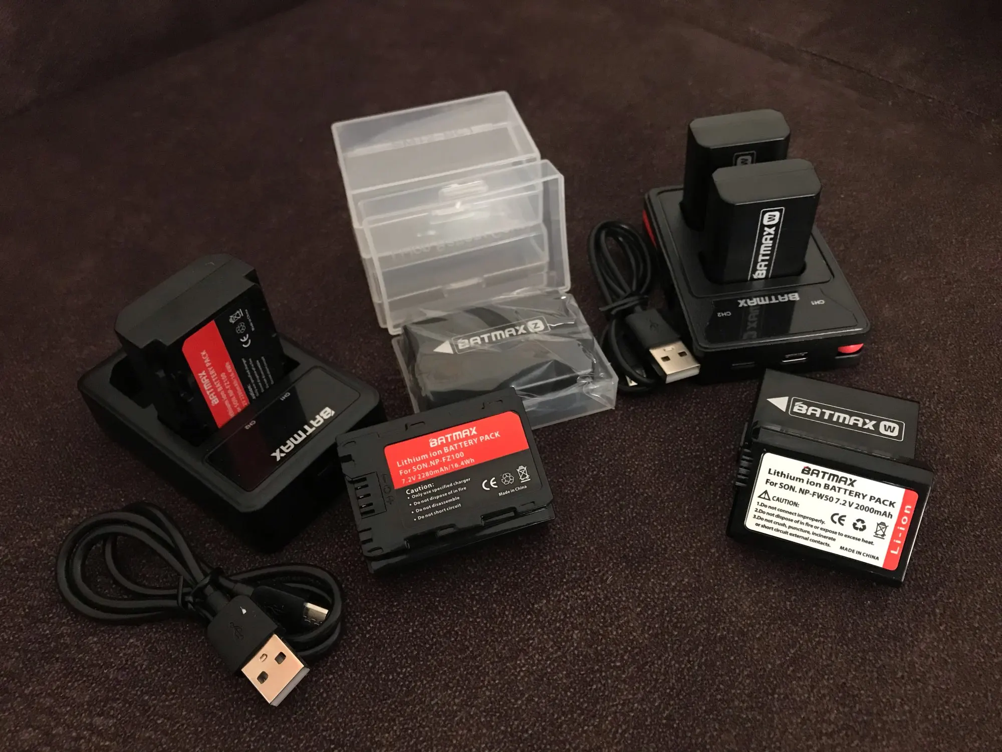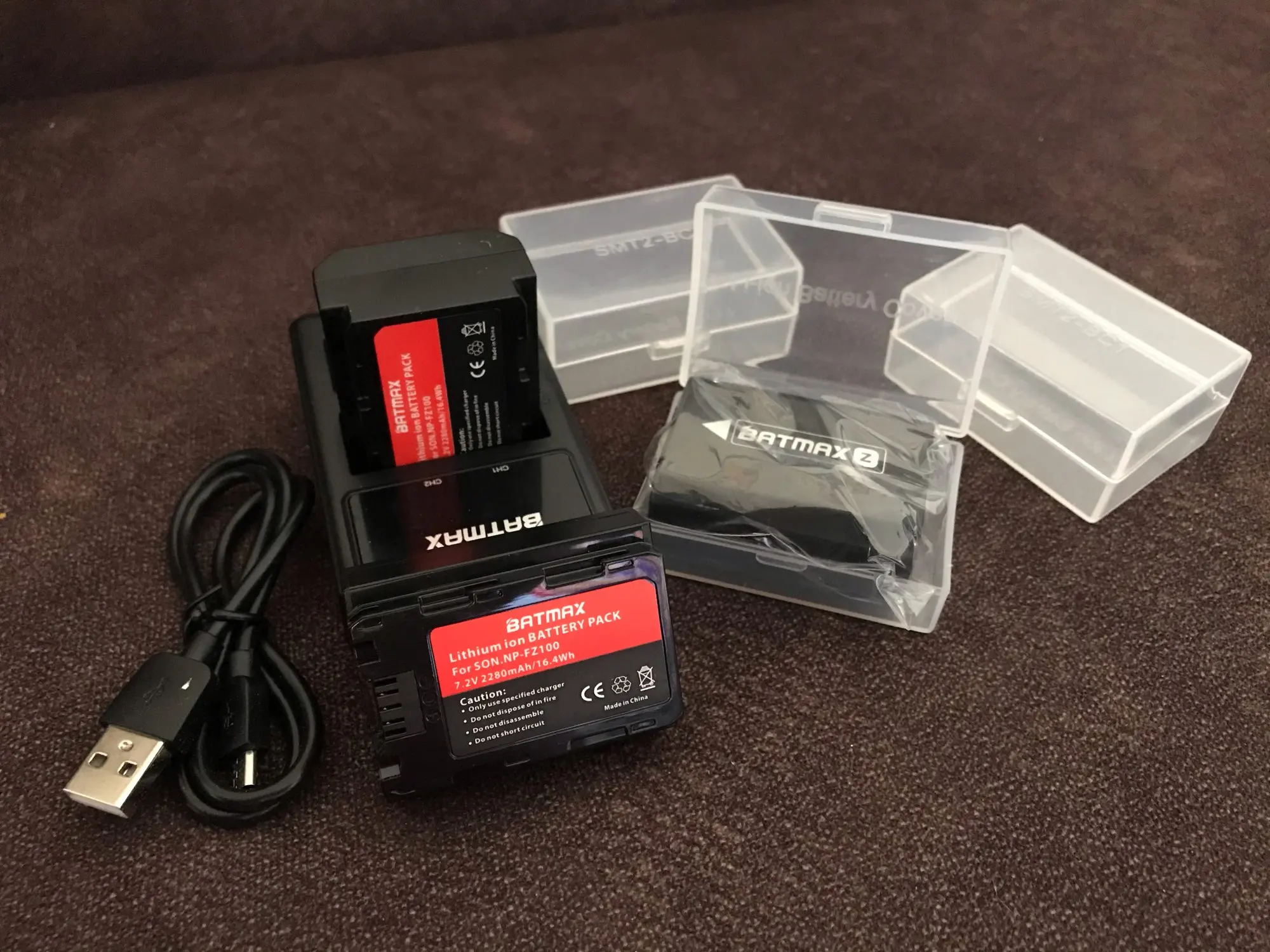 Заказывал зарядное с 4 батареями. В комплекте 2 usb-кабеля. Один - на зарядном. Второй - отдельно в упаковке. Зарядка хорошая. Как по мне, лучше, чем оригинал. Индикатор отображает, на каком этапе идёт зарядка. Так же, как мне показалось, заряжает батареи быстрее оригинала. Но сама зарядка по ощущению хлипкая. Батареи держат заряд хорошо. Поставил свою a7rii с батарейным блоком на балкон снимать таймлапс. При температуре порядка нуля градусов велась запись таймлапса в течение 2 часов. Первая батарея села в ноль. На второй осталось примерно 85%. К качеству вопросов нет. С доставкой была проблема. Заказывал сборную посылку от разных продавцов. Когда посылка пришла, этого заказа внутри не было. Открыл спор, продавец сказал, что посылка в пути, попросил подождать и дал новый трек-номер. Номер неотслеживаемый. Думал, что кидалово, тянут время. Но в итоге посылка пришла через 1,5 месяца. Претензий к продавцу не имею. Как я понял, это косяк почты, собиравшей сборную посылку.